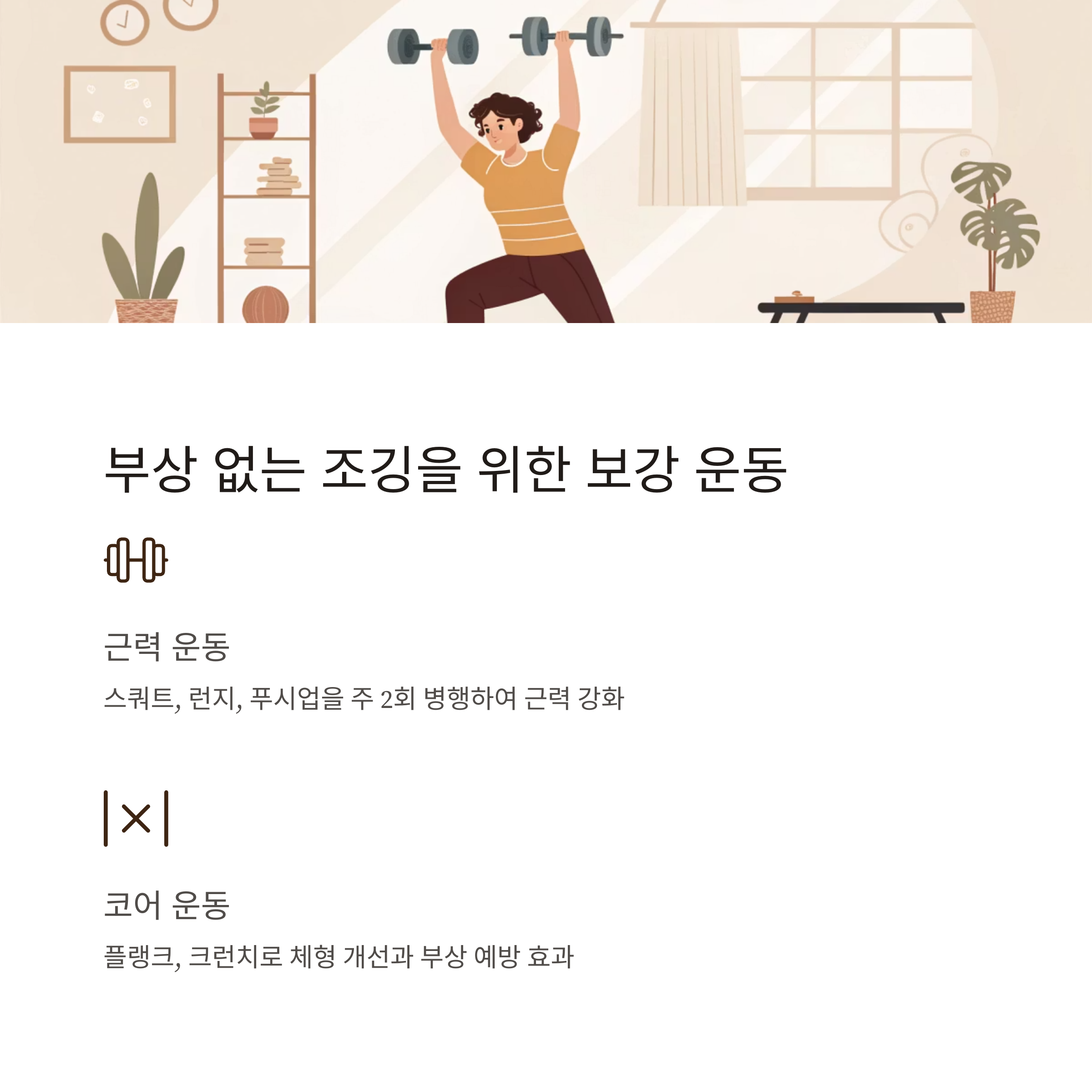 단순 조깅만으로는 근력과 균형 유지에 한계가 있습니다. 주 2회 정도는