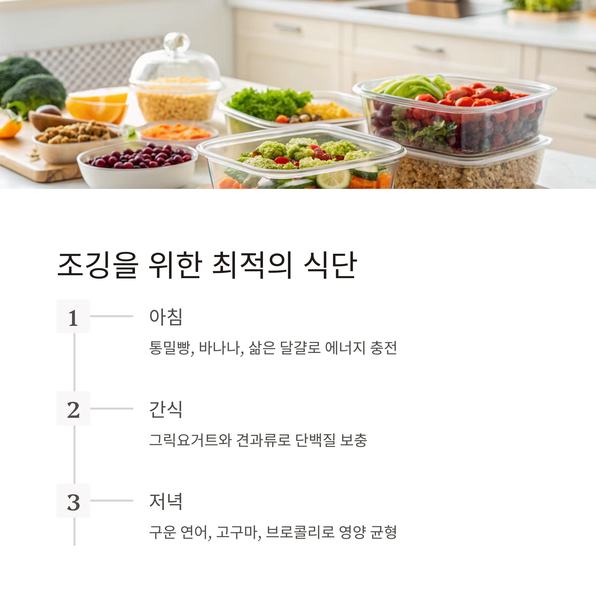 하루 식단 구성은 조깅 시간과 목적에 따라 달라져야 합니다. 아래는