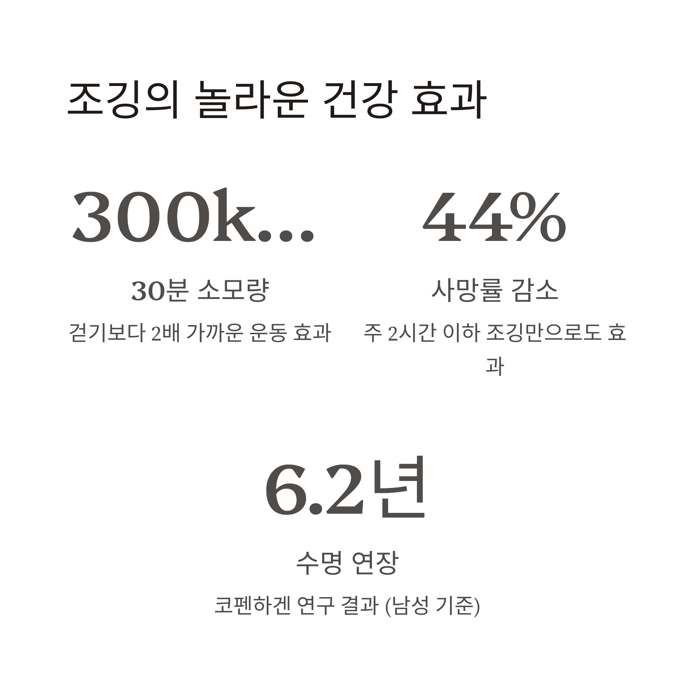 조깅은 약 250~300kcal를 소모해 걷기보다 2배 가까운 운동 효과를 냅니다.