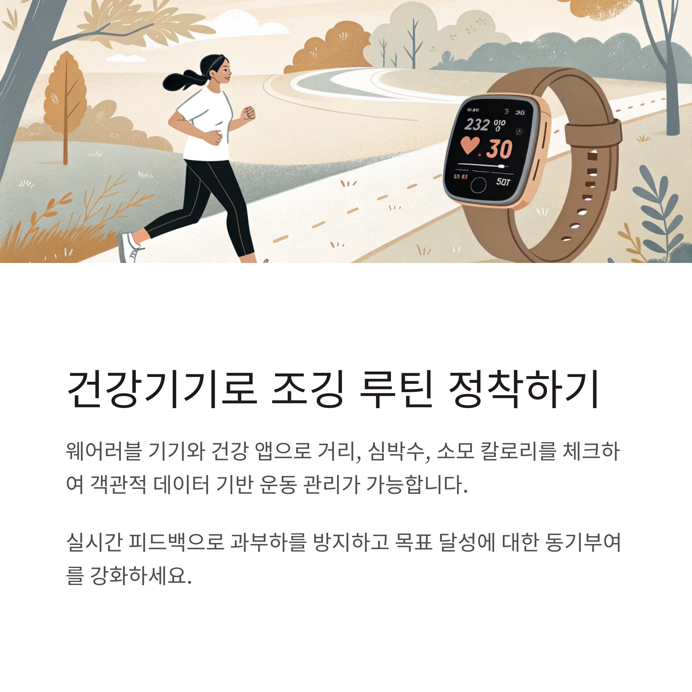 웨어러블 기기나 건강 앱을 통해 거리, 심박수, 소모 칼로리를 체크하면