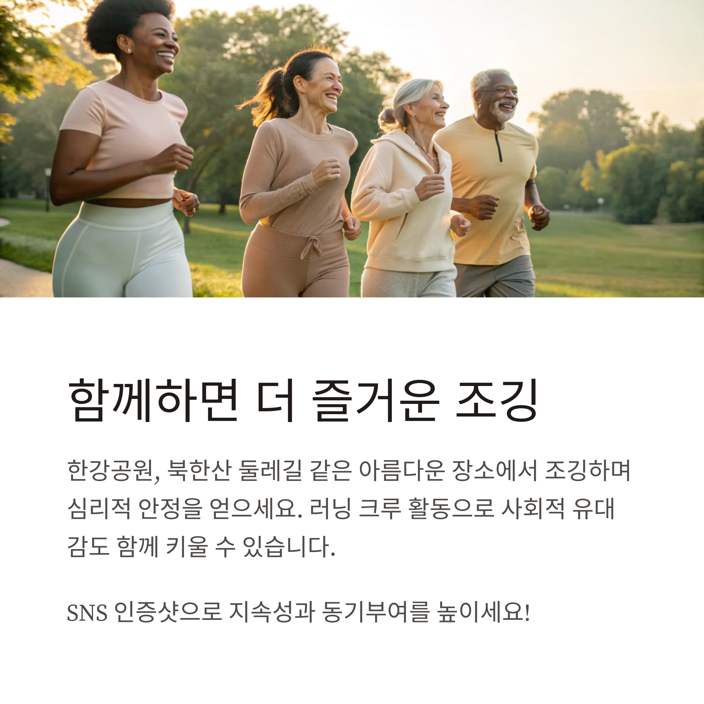 동기부여에 좋은 영향을 주며, 러닝 크루 활동으로 사회적 유대감도 함께 키울 수 있습니다.