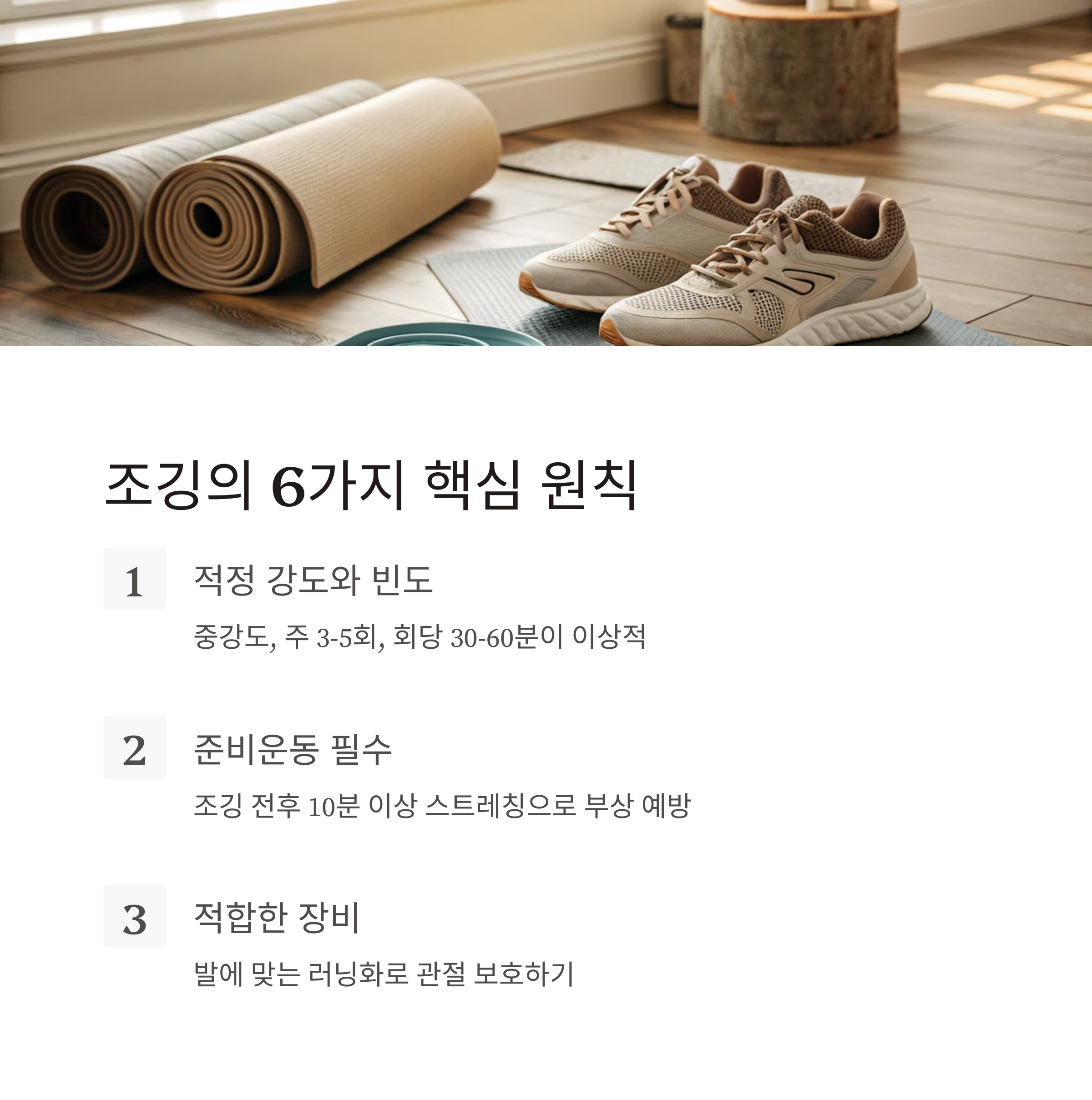 5회, 회당 3060분"이 가장 이상적입니다. - 조깅 전후 10분 이상 준비운동과 정리운동은 부상 예방에 필수입니다.