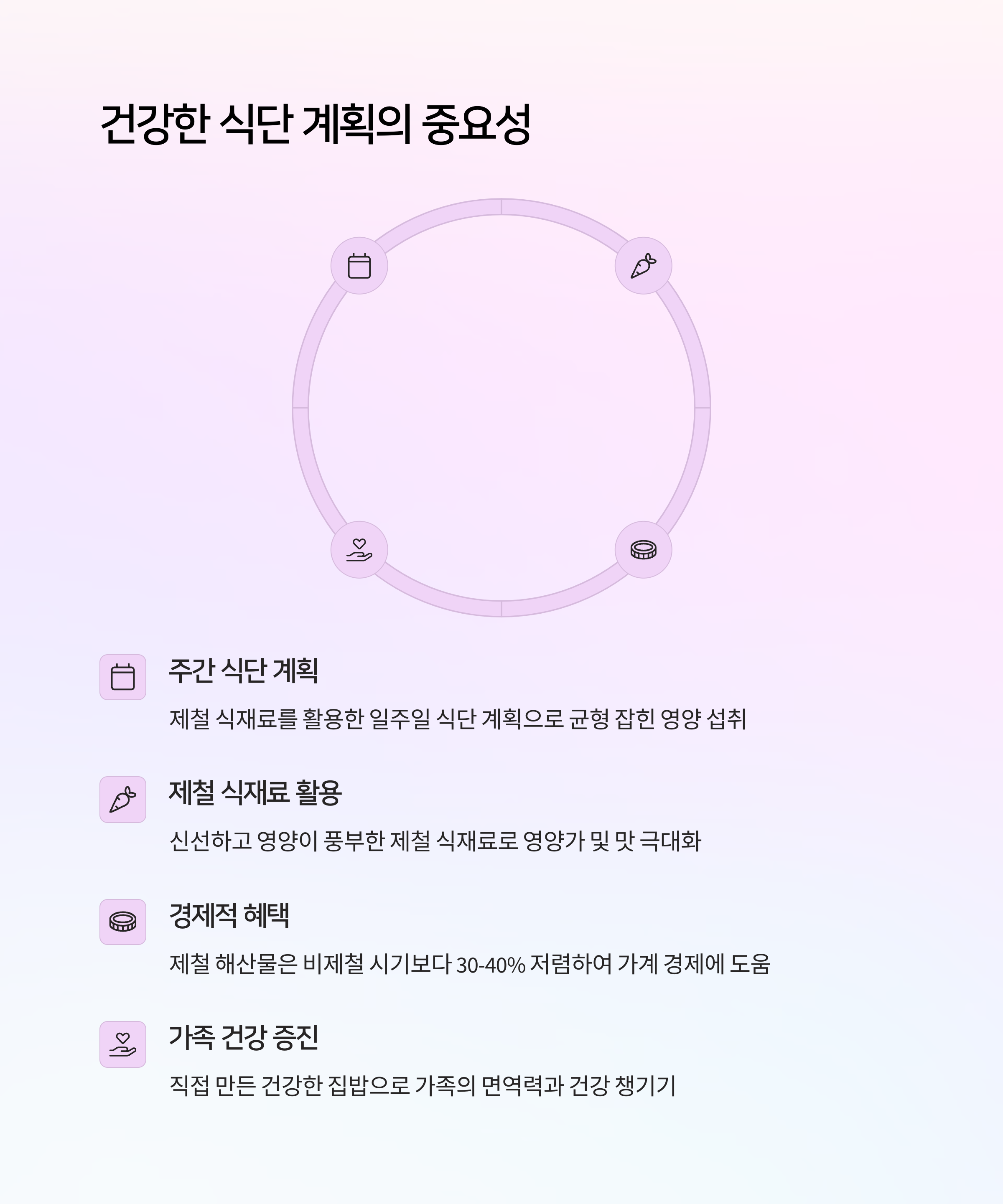 매일 무엇을 해먹을지 고민하는 시간을 줄이고, 영양 가득한 집밥으로 가족의 건강을 챙겨보세요.