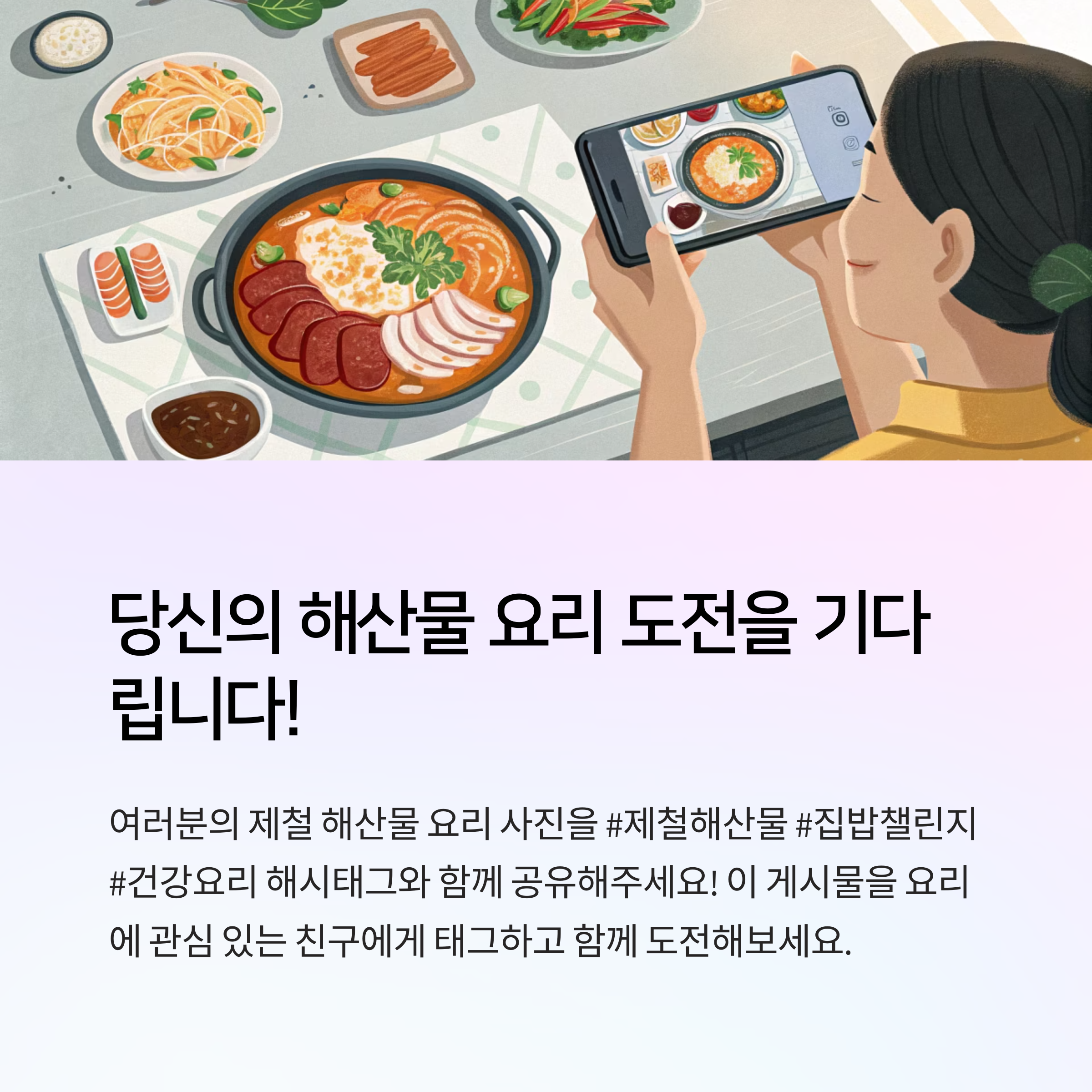 제철 해산물을 활용한 3일 반찬 만들기 챌린지, 어떠셨나요? 신선한 해산물로 만든 건강한 반찬들이 여러분의 식탁을 풍성하게 채워줄 거예요.