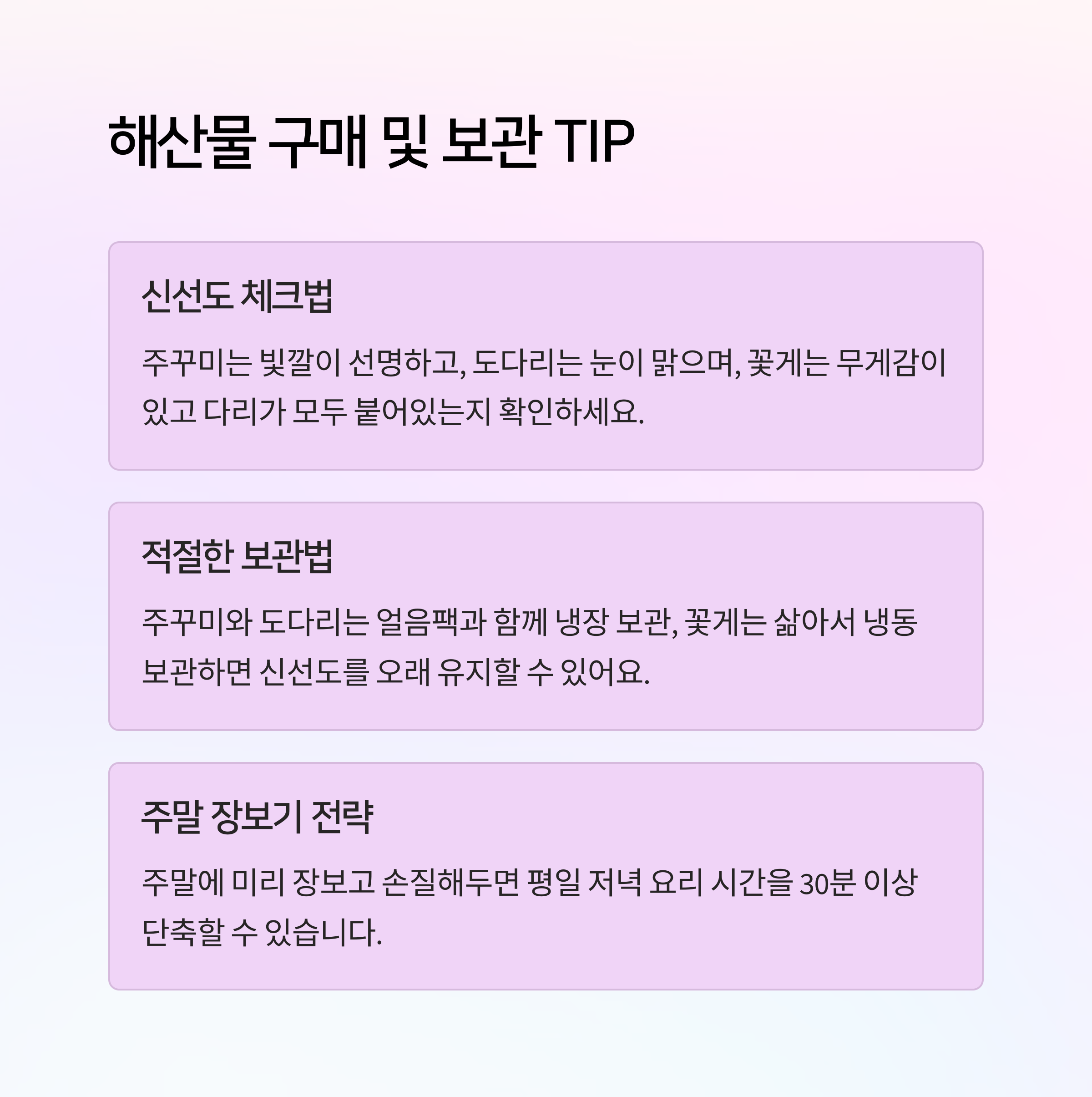 ✍️ TIP: 해산물을 구입할 때는 눈이 선명하고 비늘이 반짝이는 생선, 껍데기가 단단하고 무거운 게나 조개류를 선택하세요. 비린내가 적고 신선한 제품을 고르는 것이 맛있는 요리의 첫걸음입니다.