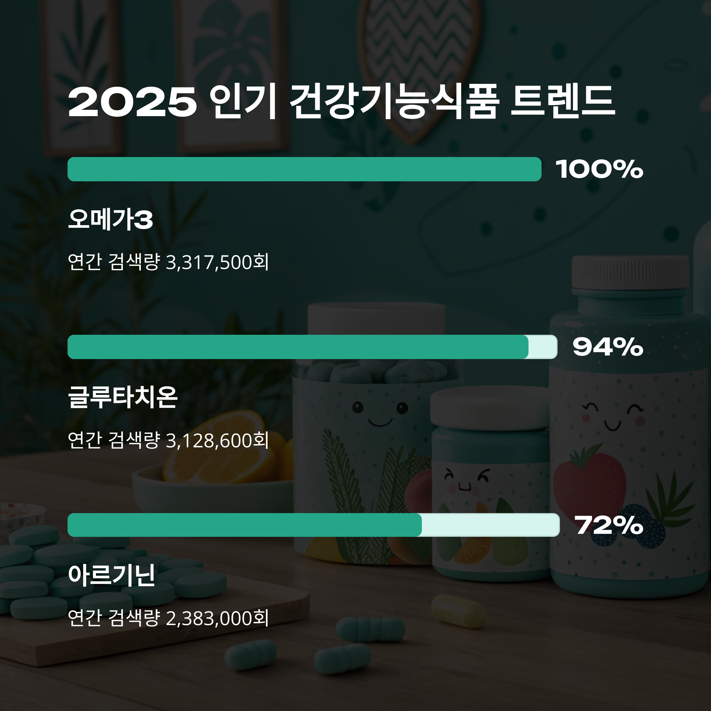2025년 상반기 기준 건강기능식품 검색 순위는 다음과 같습니다.