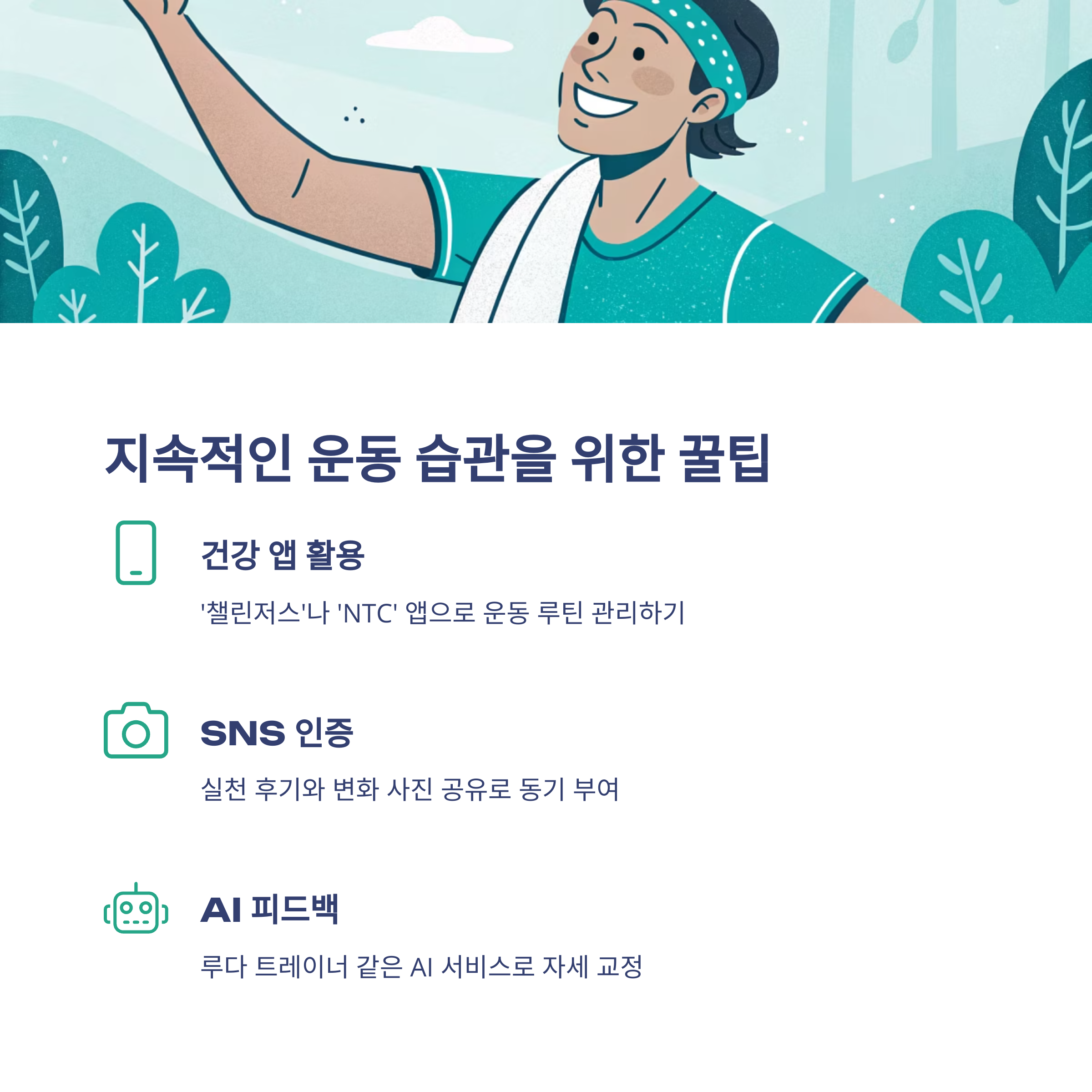 건강 앱, SNS 인증, 챌린지 프로그램 등은 운동 습관을 만드는 데 큰 도움이 됩니다. ‘챌린저스’나 ‘NTC’ 앱은 운동 루틴을 쉽게 관리할 수 있으며, 루다 트레이너처럼 AI 피드백을 제공하는 서비스는 자세 교정에 효과적입니다. 실천 후기와 변화 사진을 SNS에 공유하면 자신감과 동기를 더욱 키울 수 있습니다.