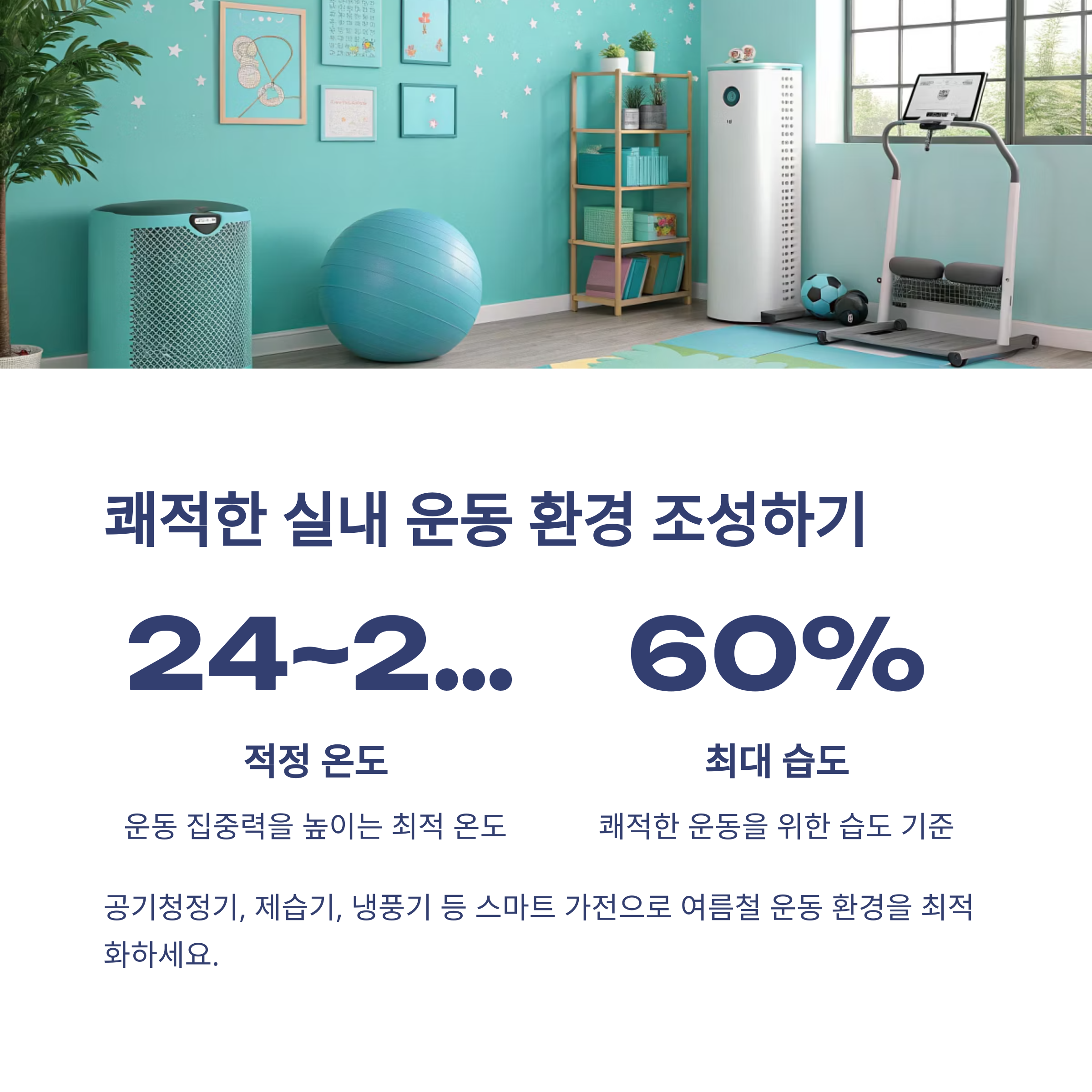 쾌적한 실내 운동 환경을 위해 실내 온도는 24~27℃, 습도는 60% 이하를 유지해야 합니다. 공기청정기, 제습기, 냉풍기 등 스마트 가전을 활용하면 더운 여름에도 운동 집중력을 높일 수 있습니다. 운동 후에는 반드시 샤워와 수분 섭취를 통해 회복 시간을 갖는 것이 좋습니다.
