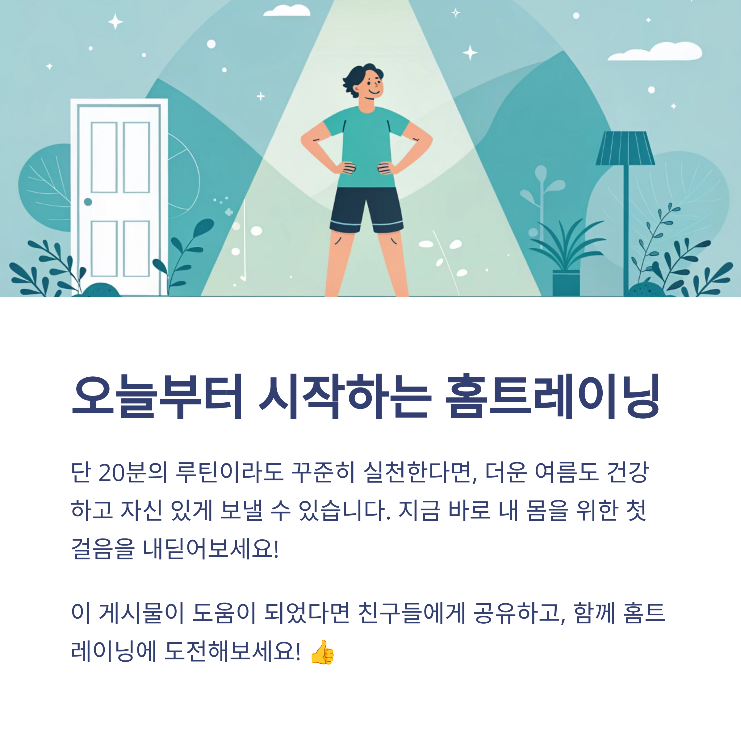 홈트레이닝은 시간과 비용, 장소의 제약 없이 누구나 실천할 수 있는 건강 습관입니다. 단 20분의 루틴이라도 꾸준히 실천한다면, 더운 여름도 건강하고 자신 있게 보낼 수 있습니다. 오늘 바로, 내 몸을 위한 첫 걸음을 내딛어보세요.