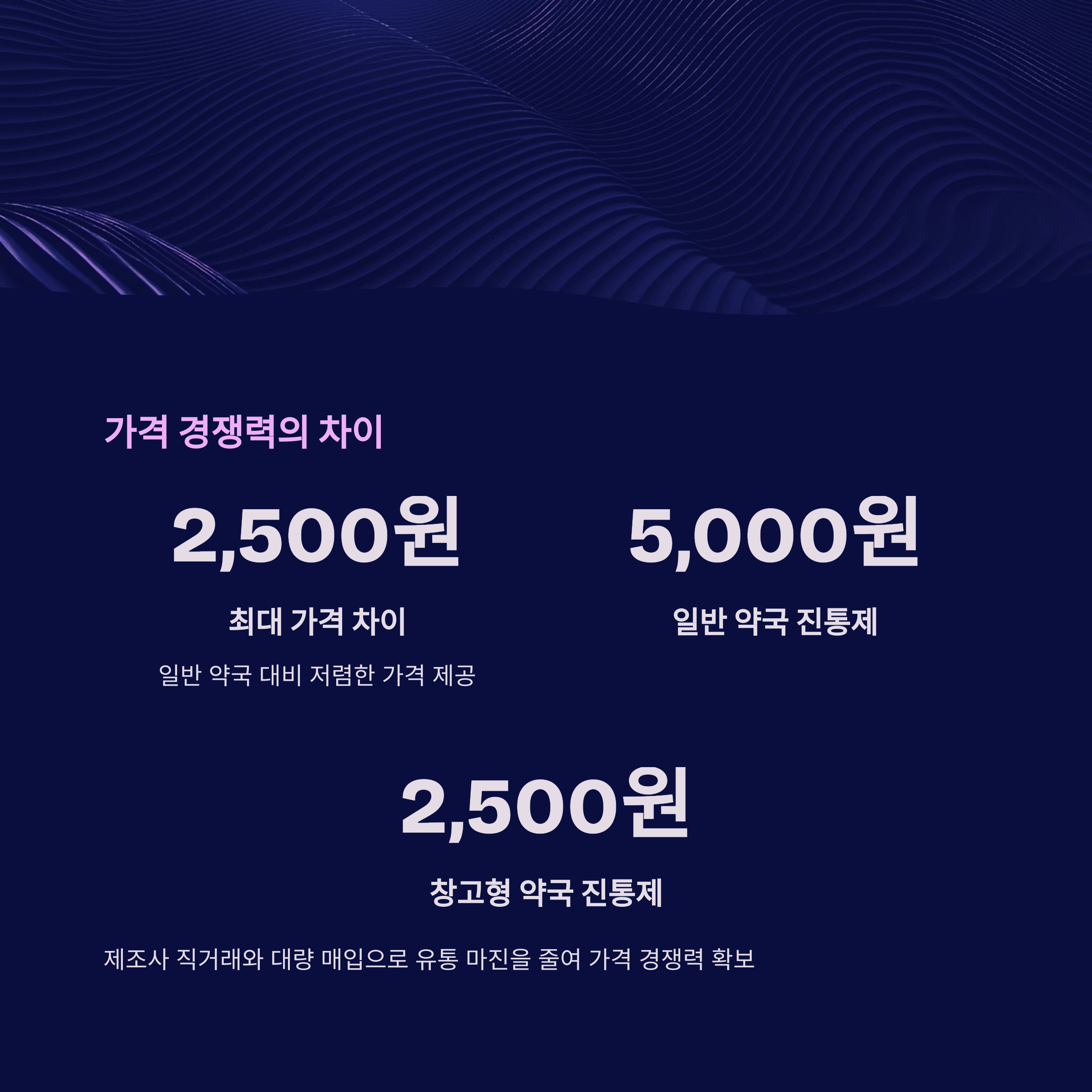 일반 의약품 가격이 기존 약국 대비 최대 2,500원 이상 저렴합니다.
