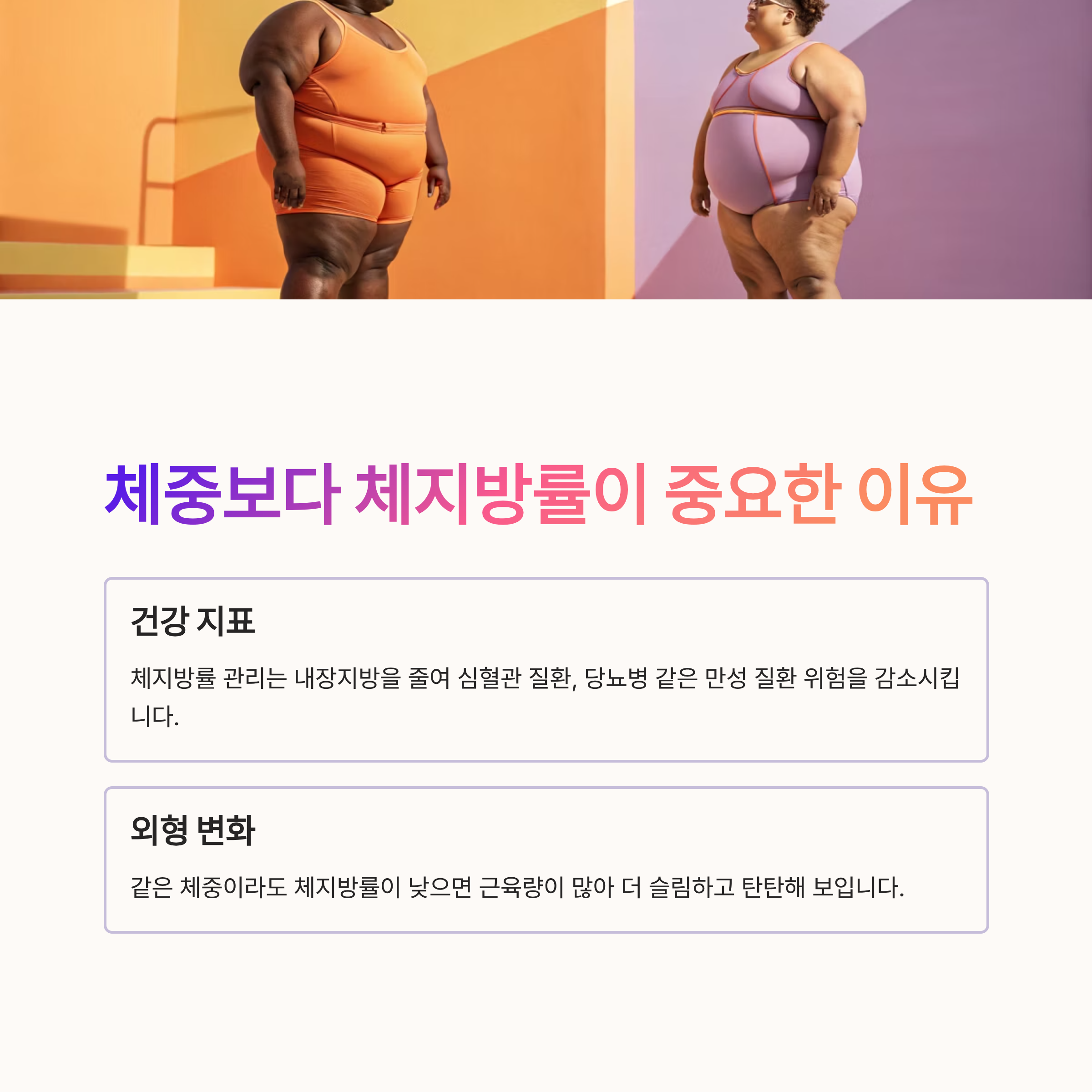 같은 몸무게라도 체지방률에 따라 몸매가 완전히 다르게 보인다는 사실! 근육은 지방보다 부피가 작기 때문에, 체지방률이 낮고 근육량이 많으면 훨씬 더 슬림하고 탄탄해 보인답니다.