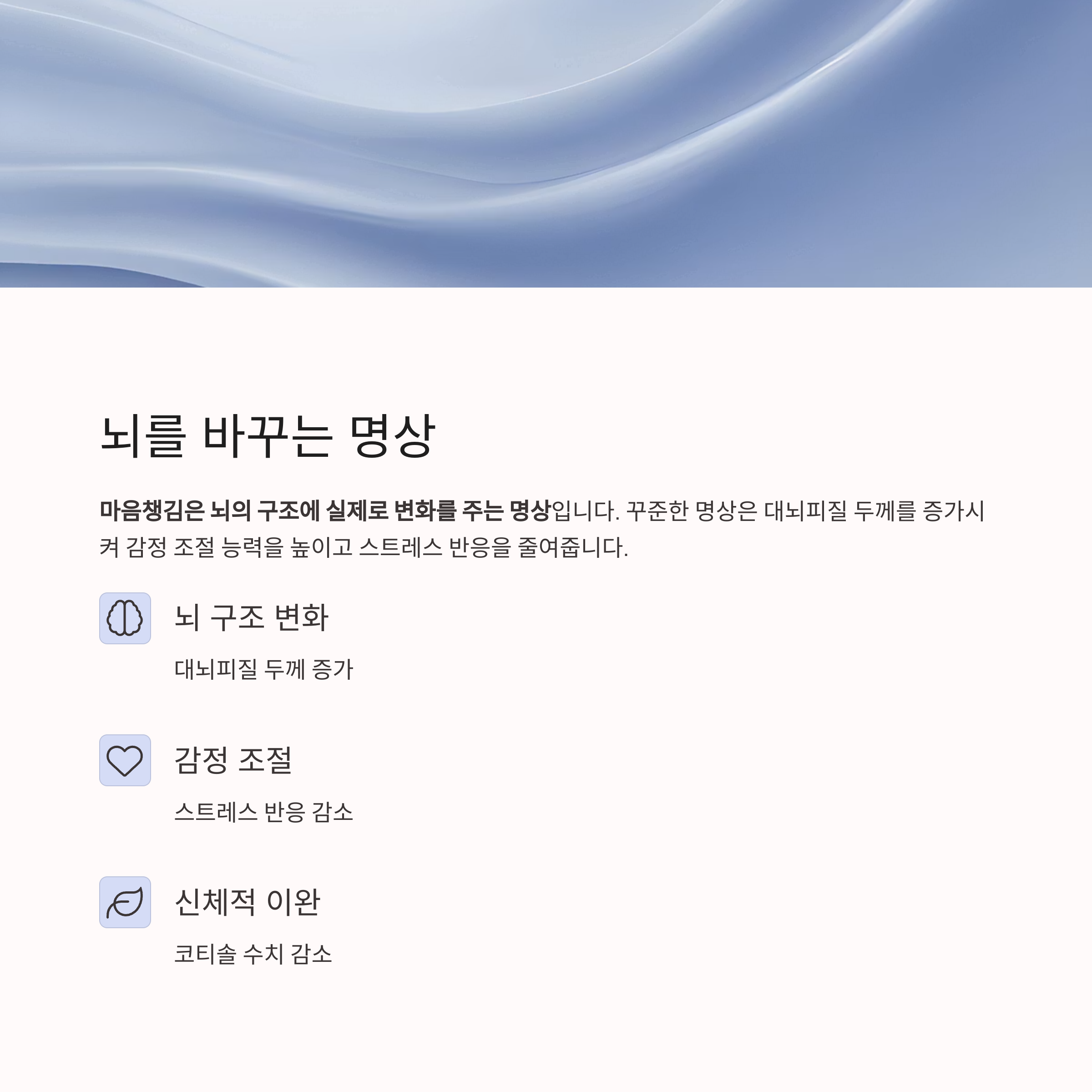정기적인 마음챙김은 심리뿐 아니라 생리학적 변화까지 유도합니다. 이는 단순한 '마음의 안정'을 넘어서 두뇌 기능 자체의 향상을 뜻합니다.
