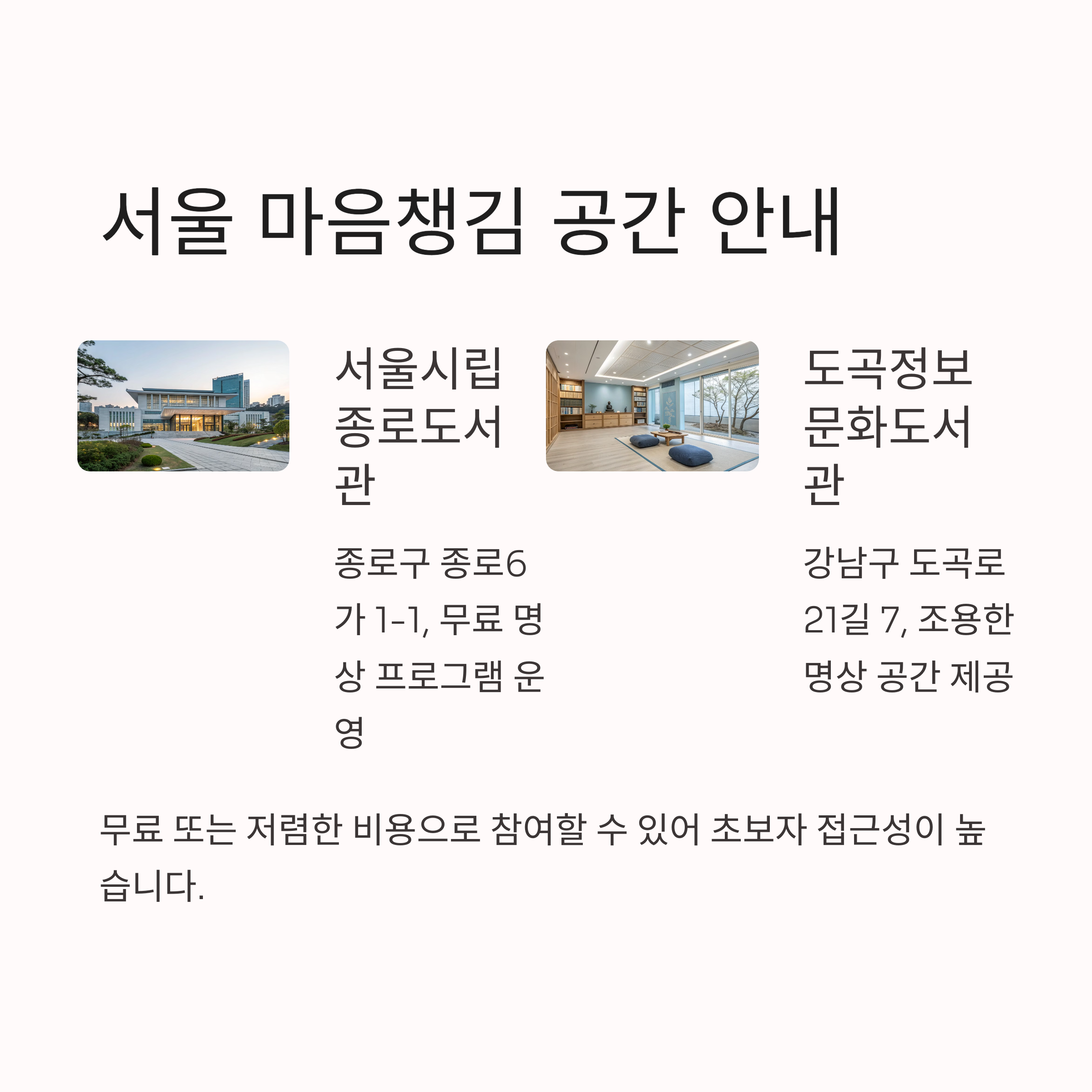 서울에서는 공공기관 주도의 명상 프로그램이 증가하고 있습니다. 무료 또는 저렴한 비용으로 참여할 수 있어 초보자 접근성이 높습니다.