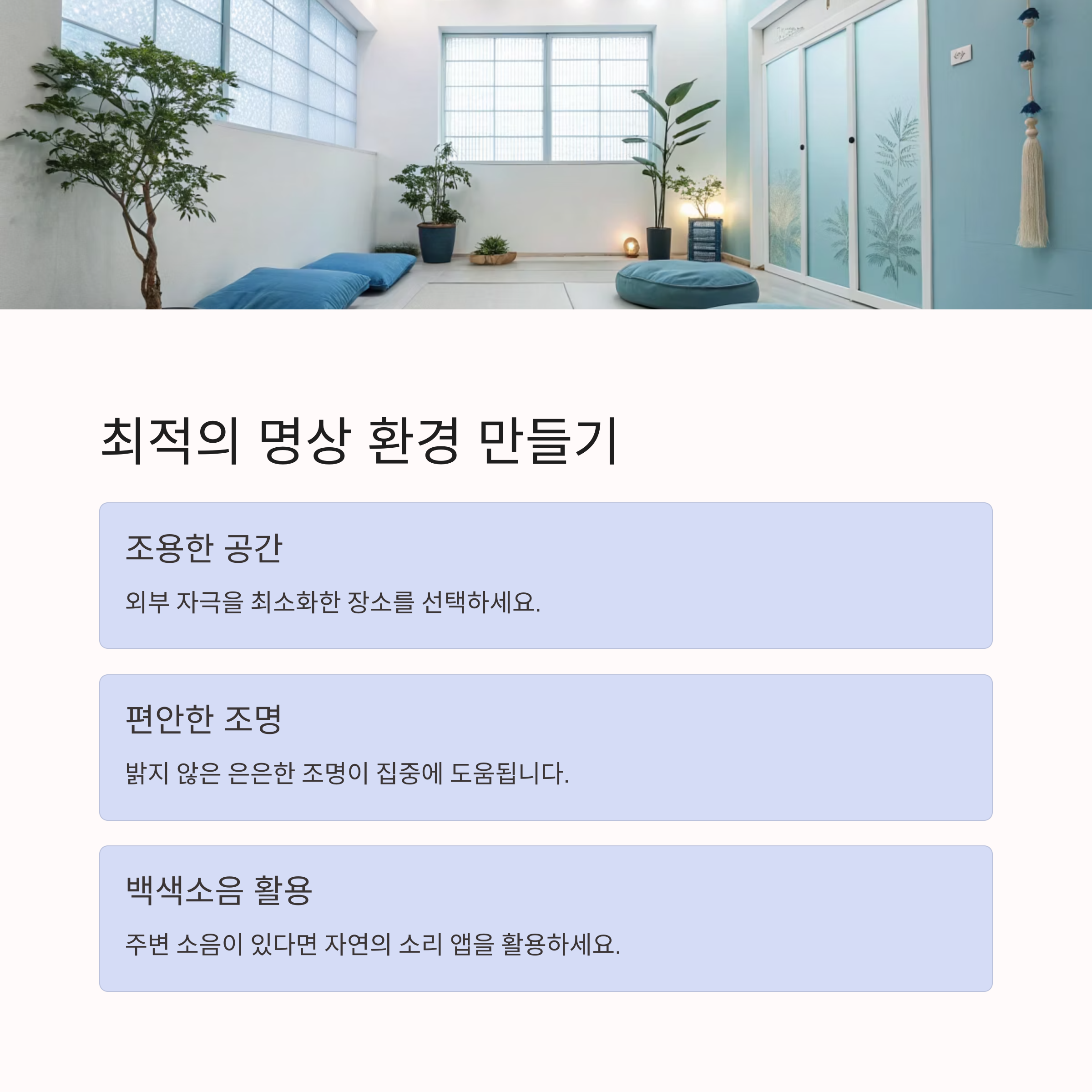 마음챙김은 외부 자극을 최소화한 조용한 공간에서 가장 효과적입니다. 조명이 밝지 않고 편안한 자세를 취할 수 있는 장소를 선택하세요. 주변 소음이 있다면 백색소음이나 자연의 소리 앱을 함께 활용해도 좋습니다. 이 작은 환경 변화가 루틴 정착의 첫걸음이 됩니다.