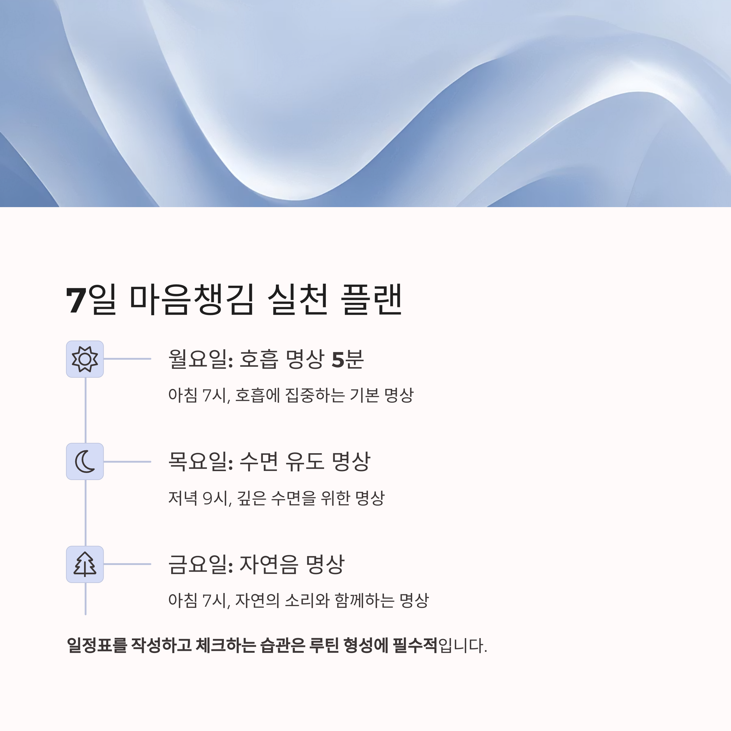 습관은 반복에서 만들어집니다. **초보자에게 가장 추천되는 시작 방식은 '매일 같은 시간에 5분 실천'**입니다. 기상 직후 또는 잠자기 전 시간을 정해두고 명상 앱을 활용하면 시작이 쉬워집니다. 스마트폰 알람을 습관화 도구로 활용하는 것도 효과적입니다.