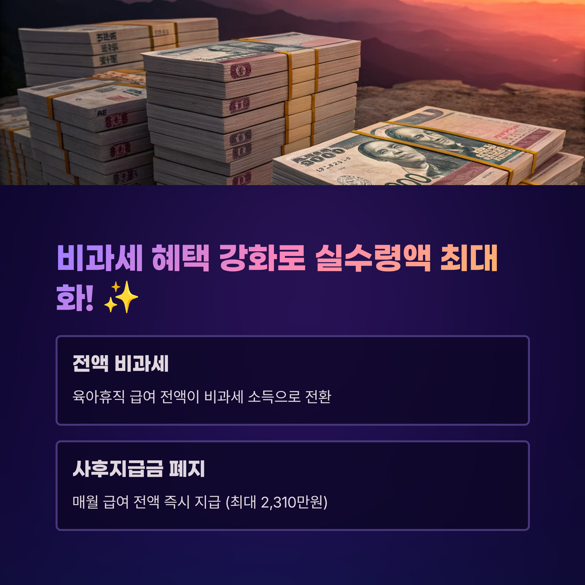 두 번째 핵심은 바로 비과세 혜택의 극적인 확대입니다. 과거에는 소득세, 주민세 등을 신경 써야 했지만, 2025년부터는 고용보험법에 따라 지급되는 육아휴직 급여 전액이 비과세 소득에 해당합니다. 즉, 세금 걱정 없이 급여 총액을 그대로 받을 수 있다는 얘기죠! 사립학교 사무직처럼 일부 예외는 있지만, 대부분의 직장인에게는 아주 좋은 소식입니다.