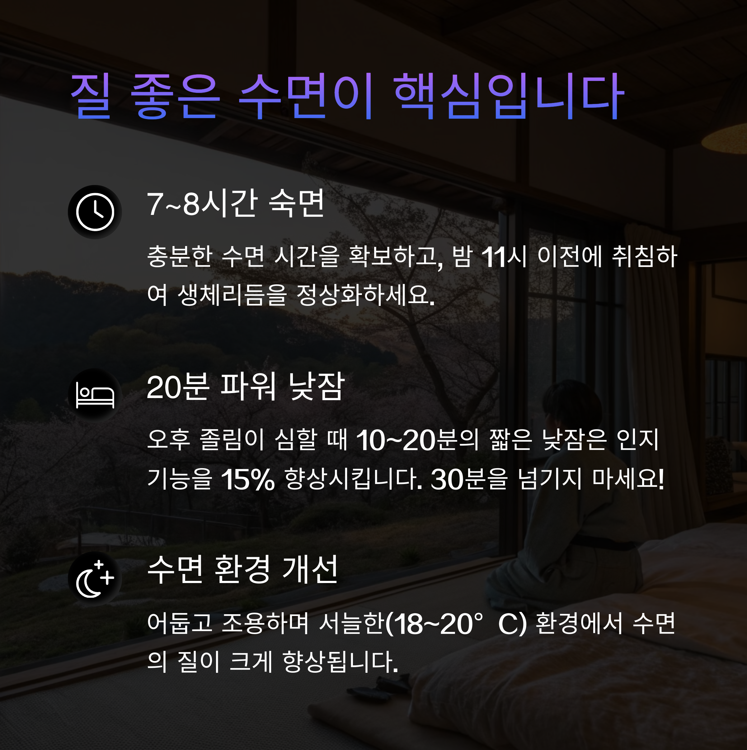 😴 수면 팁: 스마트폰 사용 줄이기, 침실 환경 개선, 일정한 수면 시간 유지하기