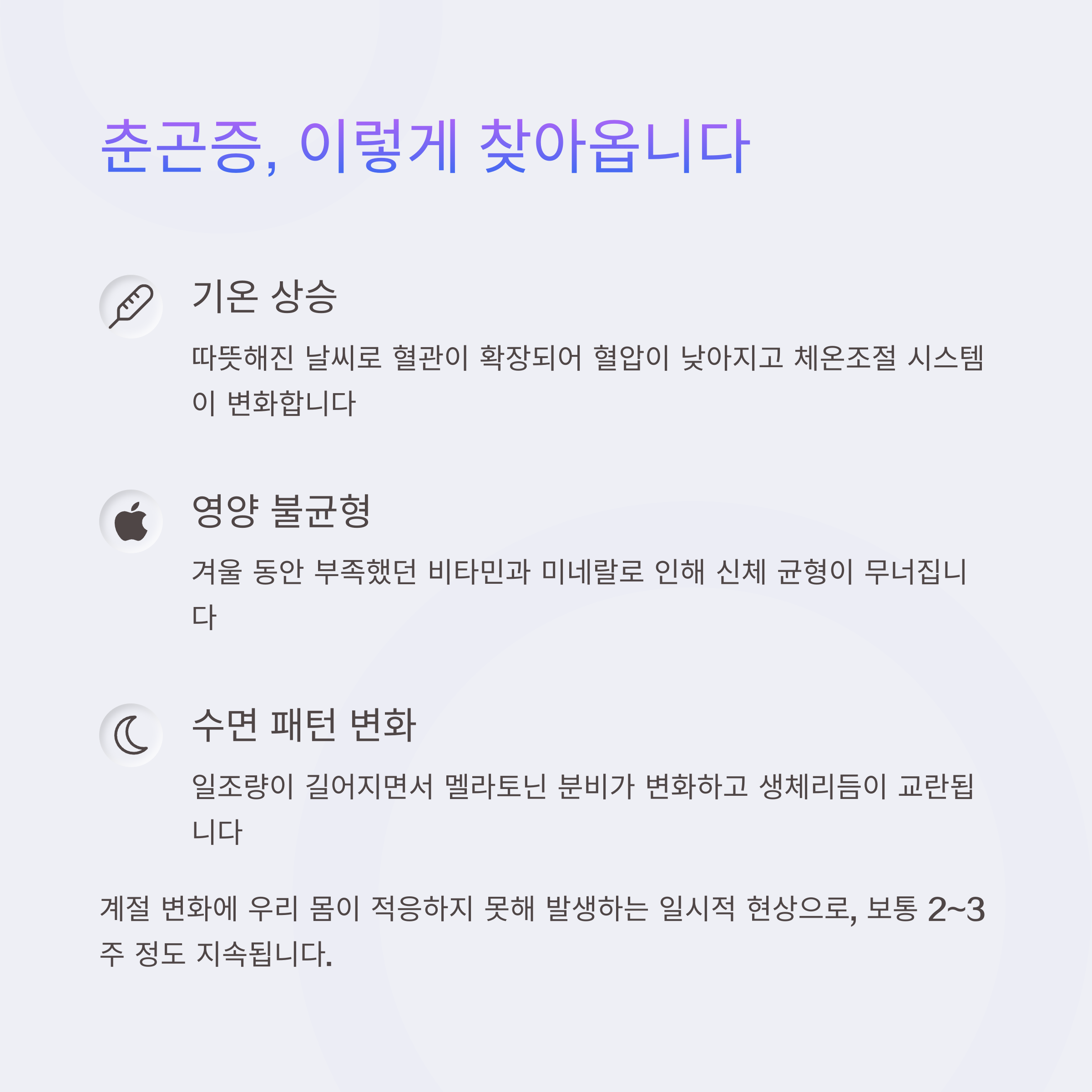 춘곤증은 특별한 질병이 아니라 계절 변화에 우리 몸이 적응하면서 나타나는 일시적인 현상입니다. 겨울에서 봄으로 넘어오면서 우리 몸의 신진대사가 변화하고, 이 과정에서 일시적인 피로감을 느끼게 되는 거죠.
