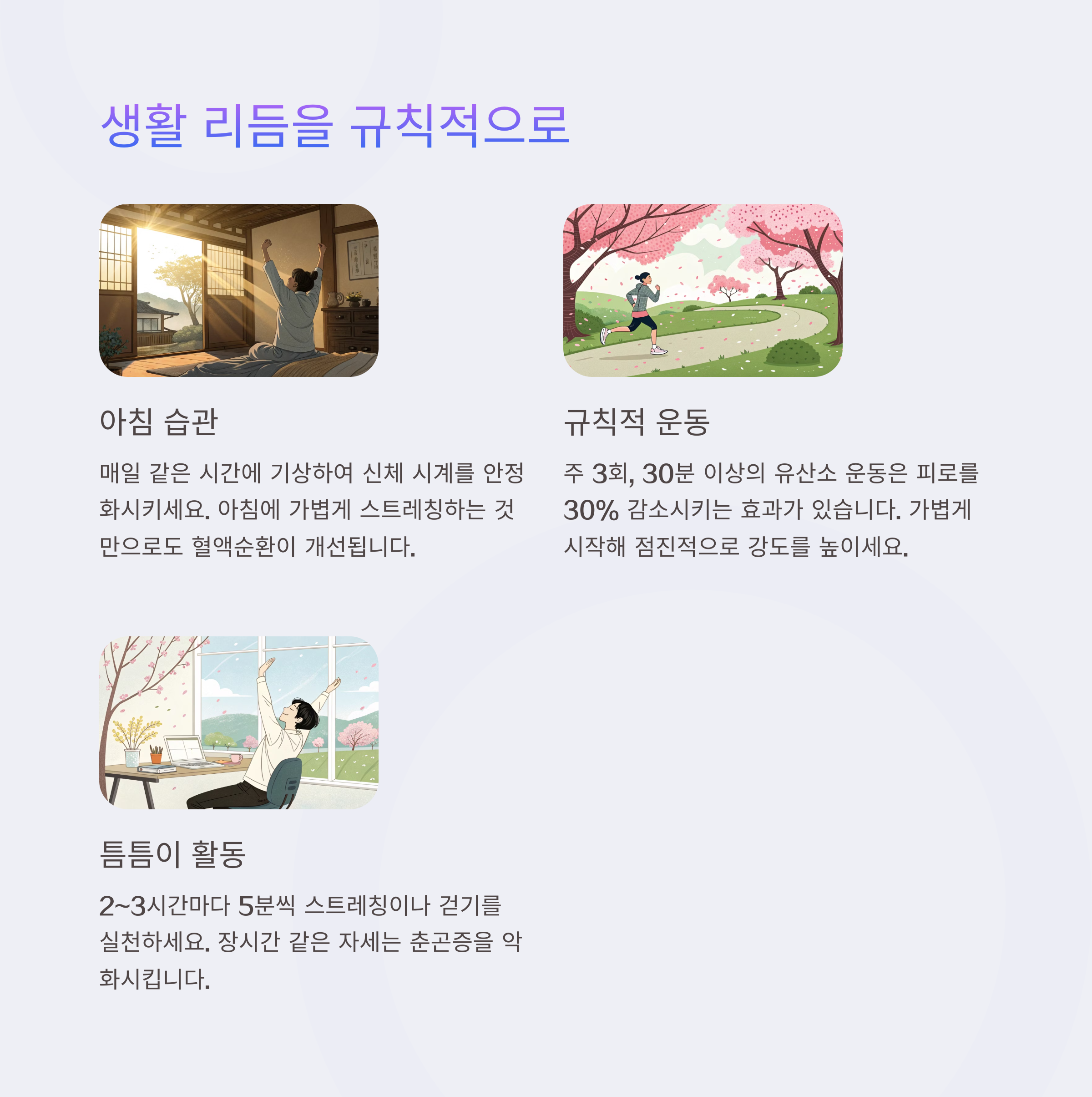 일정한 시간에 식사하는 것도 중요해요. 불규칙한 식사는 혈당 변화를 크게 만들어 피로감을 더 심하게 느끼게 할 수 있거든요.