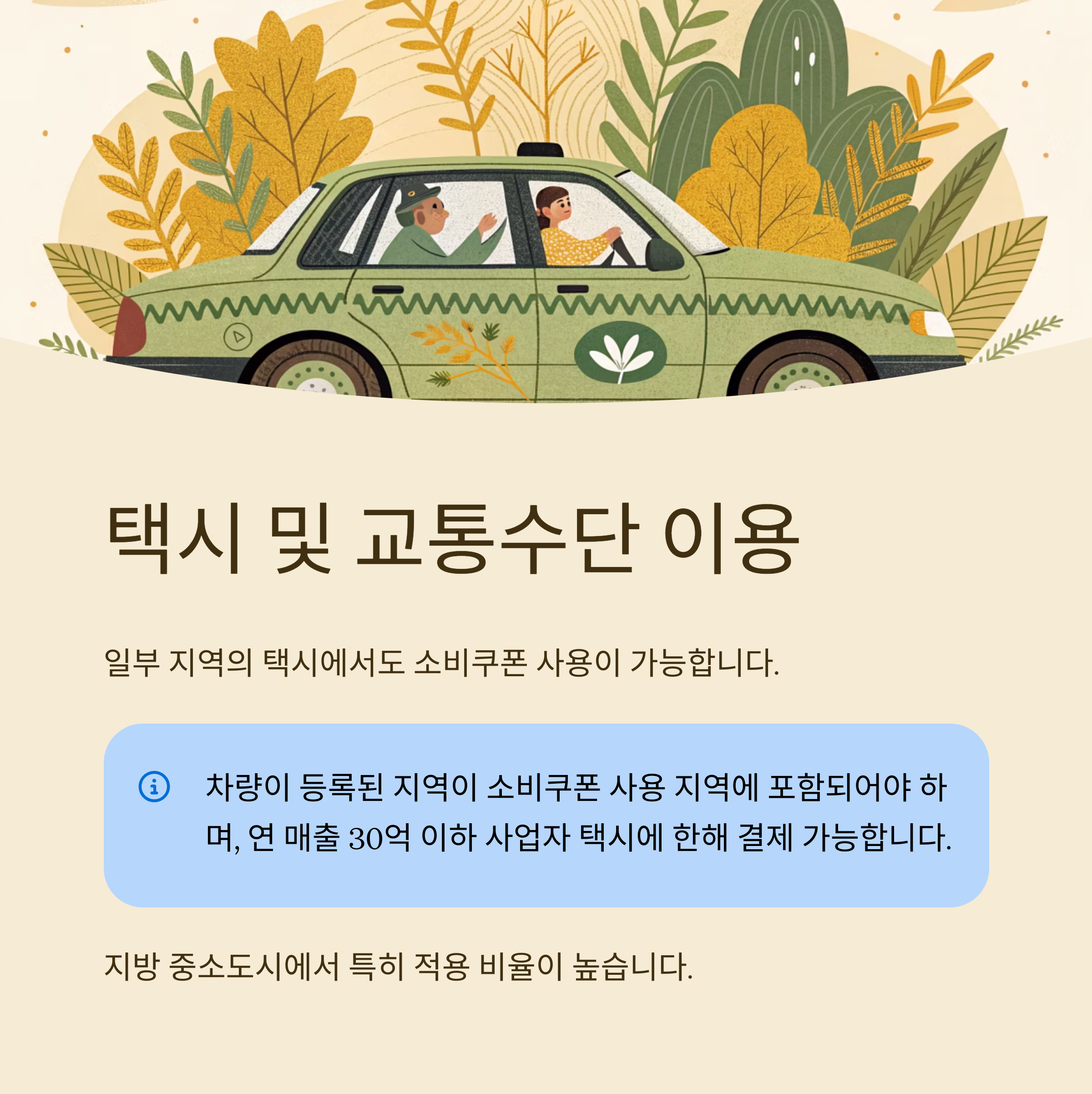 일부 지역의 개인택시, 법인택시에서 소비쿠폰 사용이 가능합니다.