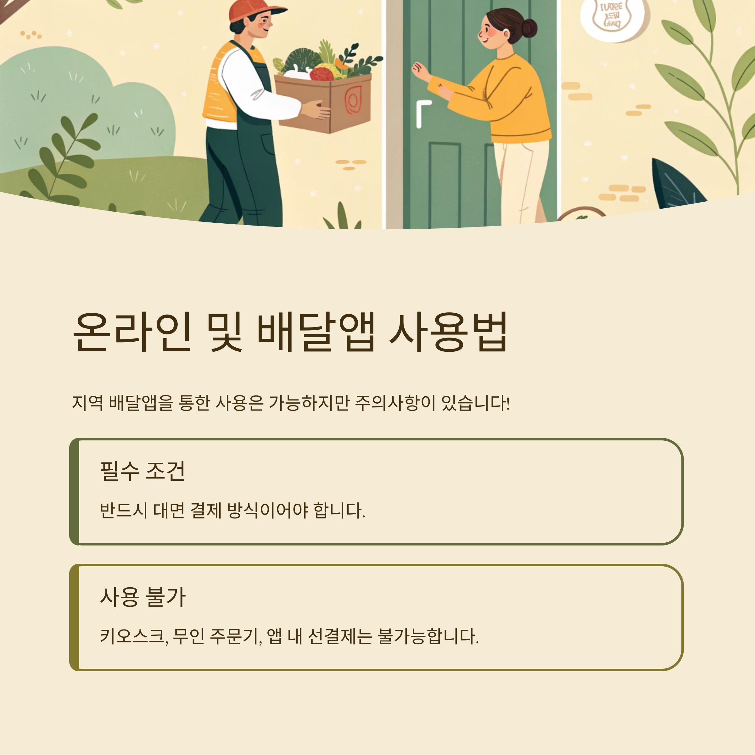 지역 배달앱을 통한 사용은 가능하지만 반드시 대면 결제 방식이어야 합니다.
