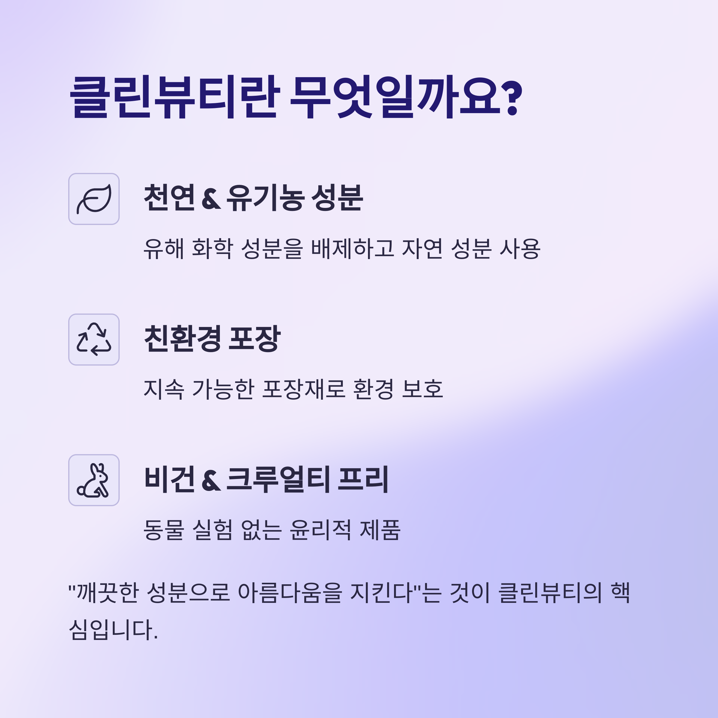 "깨끗한 성분으로 아름다움을 지킨다"는 것이 클린뷰티의 핵심입니다.