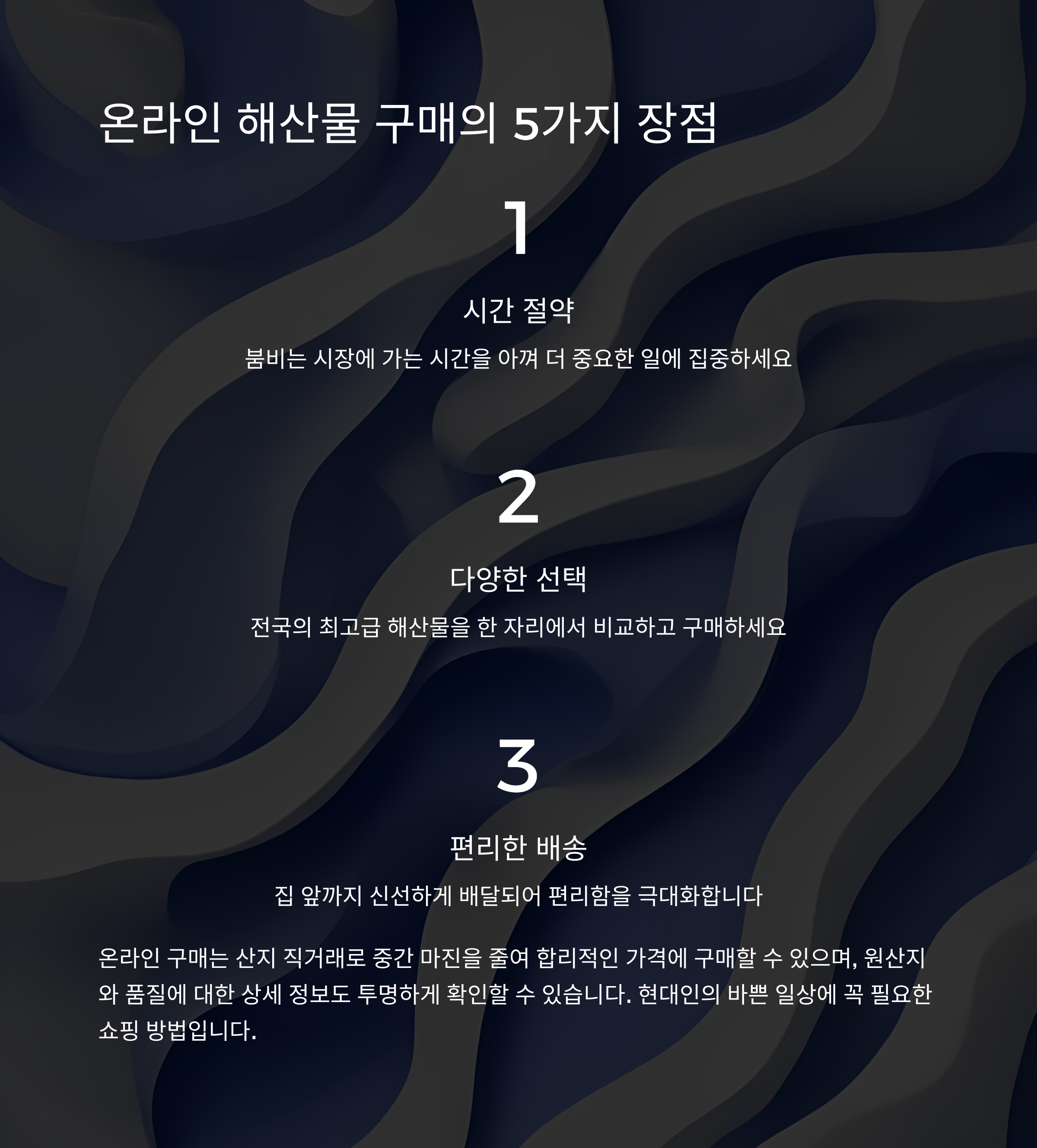 이제 택배로도 신선한 제철 해산물을 즐길 수 있다는 것, 알게 되셨나요? 온라인 쇼핑의 발달로 시장에 직접 가지 않아도 신선한 해산물을 편리하게 구매할 수 있게 되었습니다.