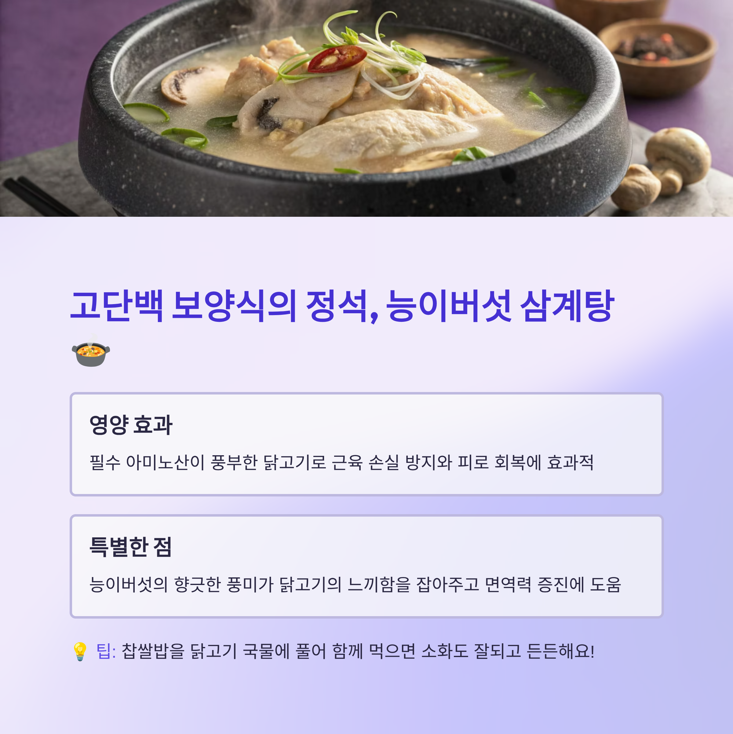 - 능이버섯 삼계탕: 고단백질과 면역력 증진 효과로 지친 체력을 보충해주는 최고의 보양식!