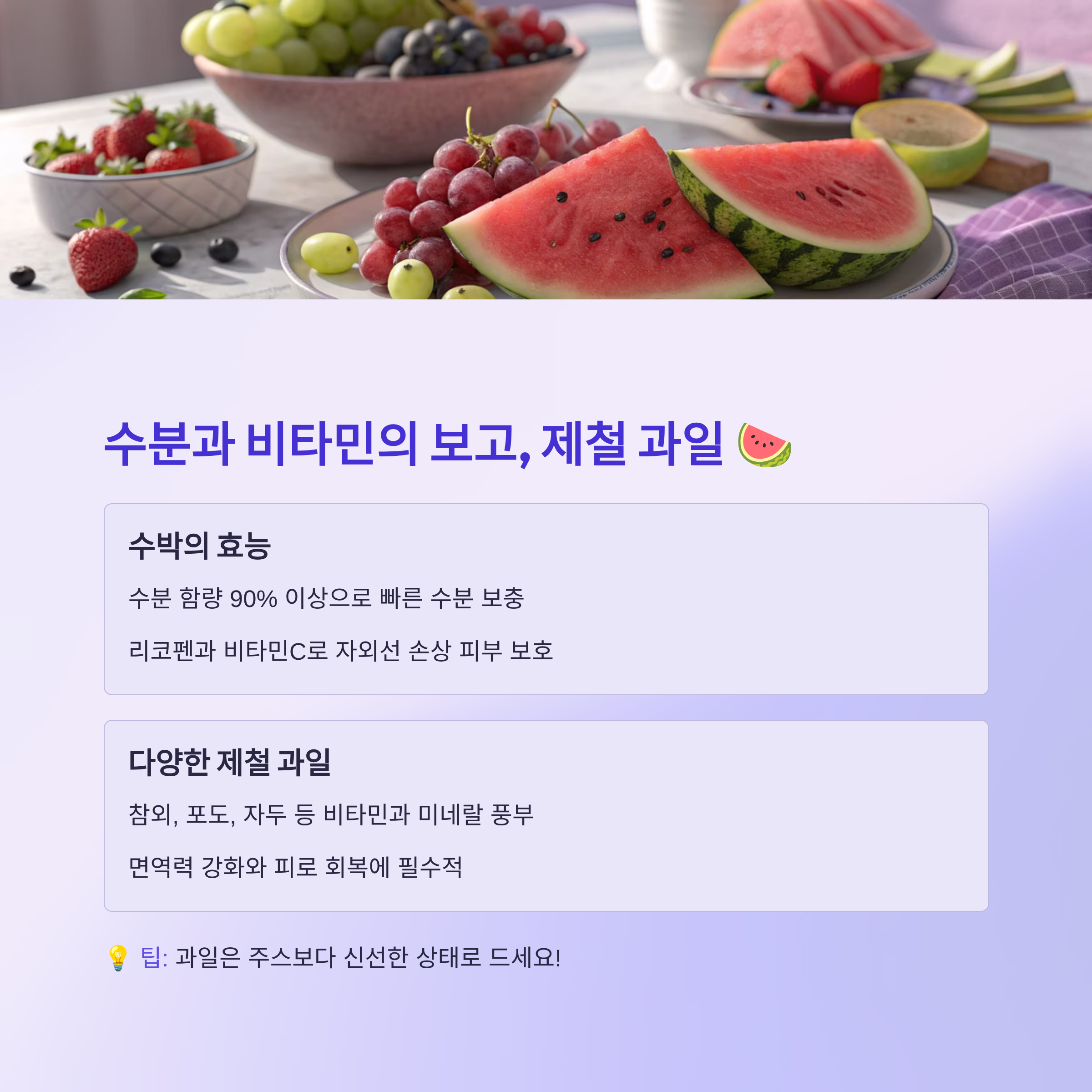 - 수박과 제철 과일: 풍부한 수분과 비타민으로 체내 수분 균형과 항산화 작용을 돕는 필수 간식!