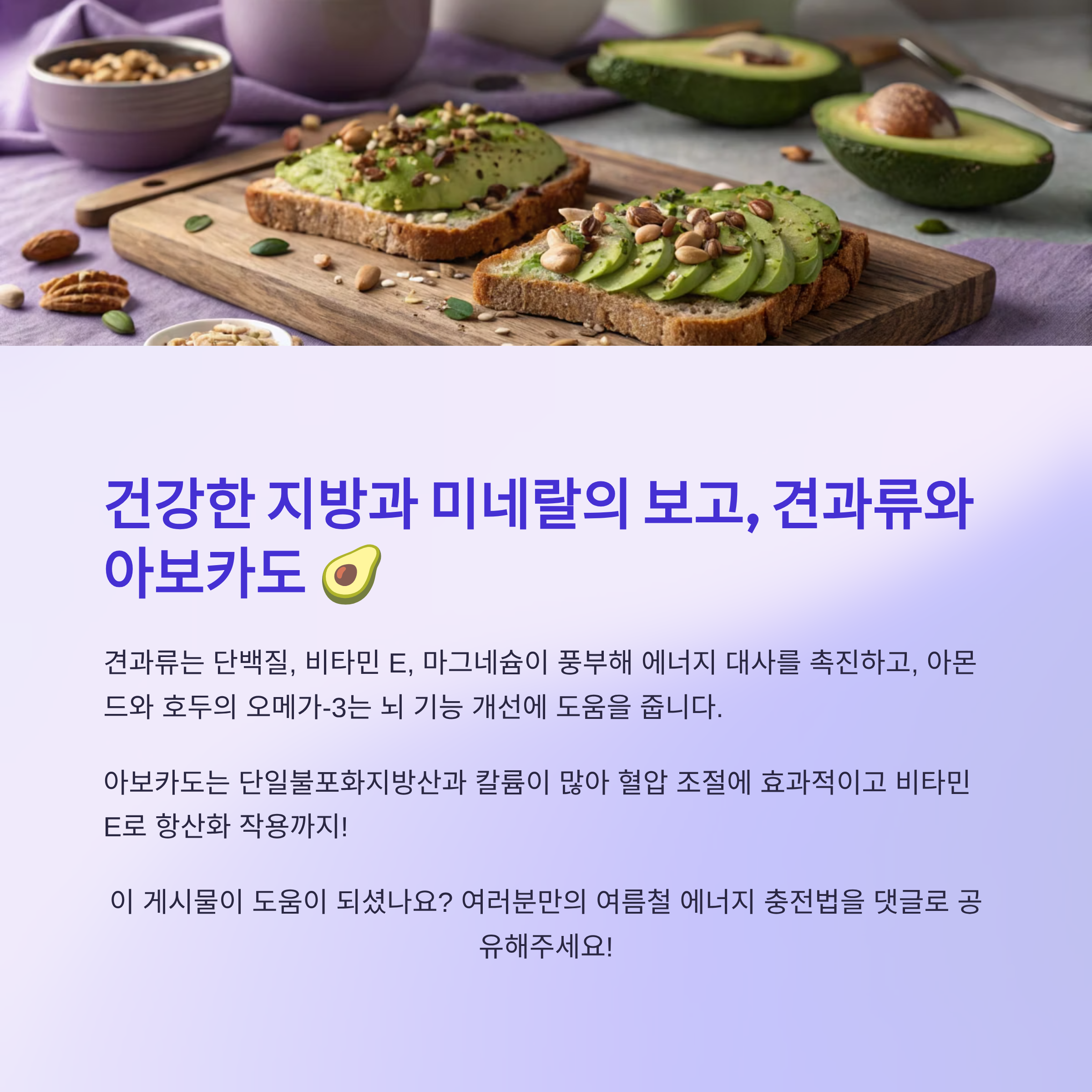 - 견과류와 아보카도: 건강한 불포화지방산과 미네랄이 풍부해 지속 가능한 에너지 공급원!