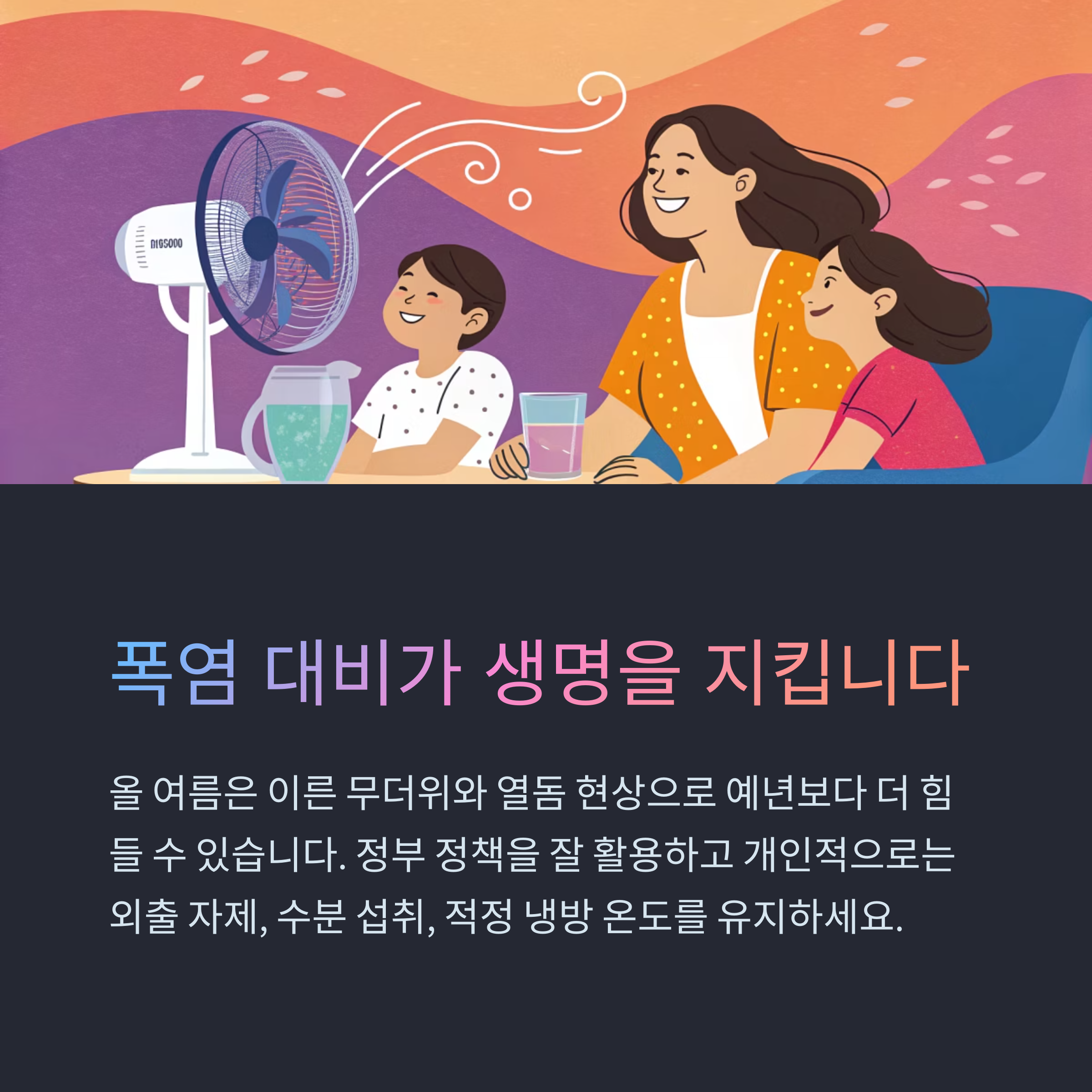 | 개인 | 외출 자제, 수분 섭취, 적정 냉방 온도 유지 |