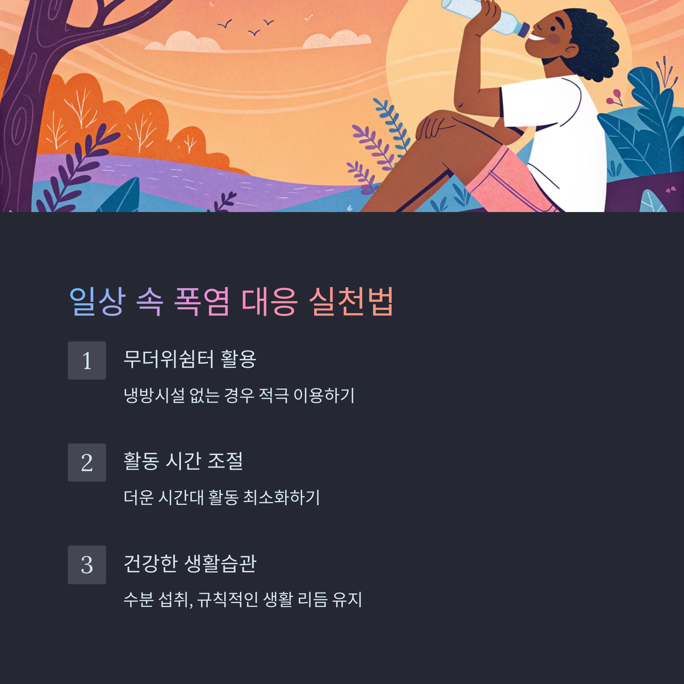 무더위를 효과적으로 이겨내기 위해서는 일상 속 작은 실천이 중요합니다. 특히 냉방시설이 없는 공간에서는 정부가 제공하는 무더위쉼터를 적극 활용하고, 더운 시간대 활동을 최소화해야 합니다. 또한 평소 건강한 생활습관과 수분 섭취, 규칙적인 생활 리듬 유지로 체력을 관리해야 합니다.