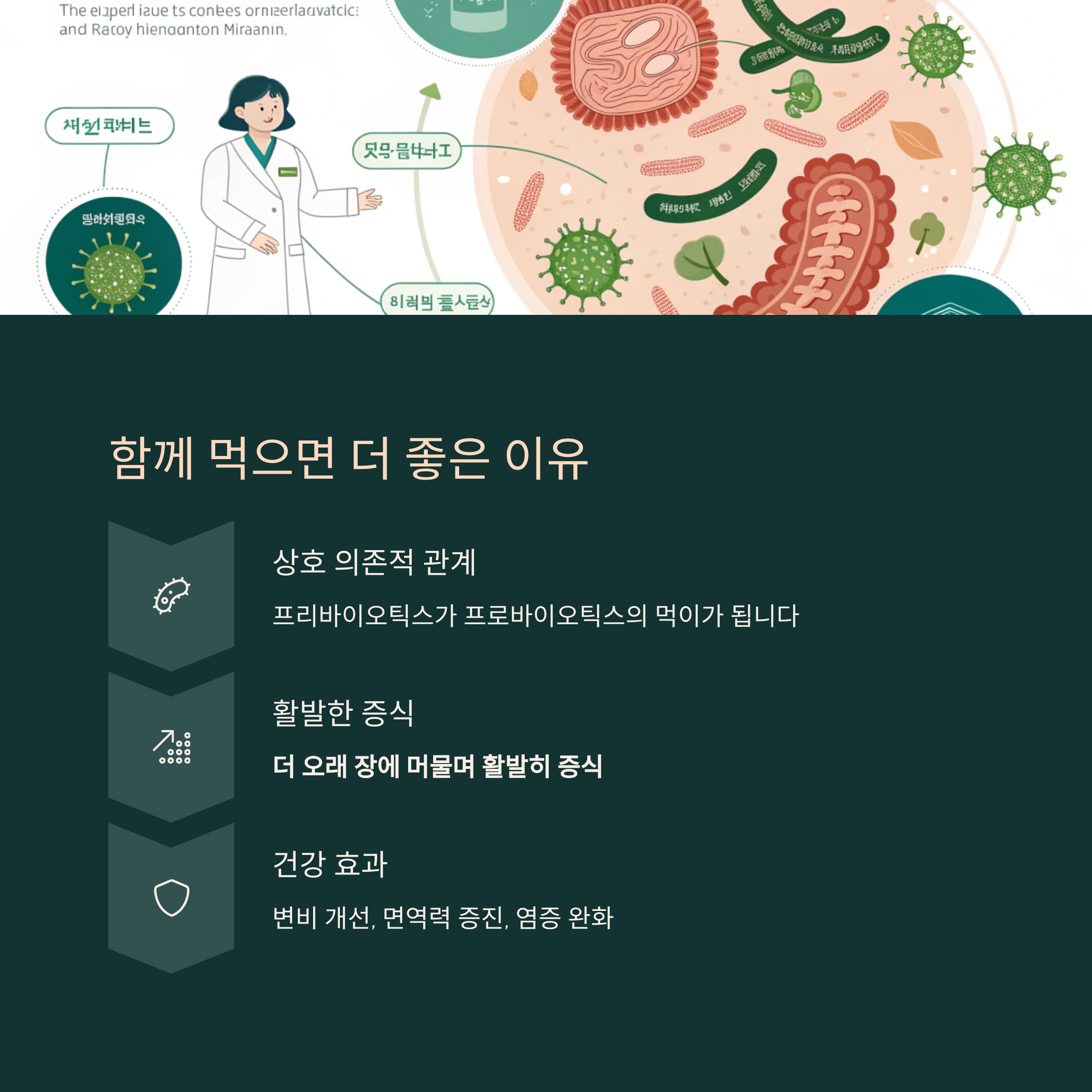 이 둘을 함께 섭취할 경우 상호보완적인 작용으로 장 건강 증진 효과가 극대화됩니다.
