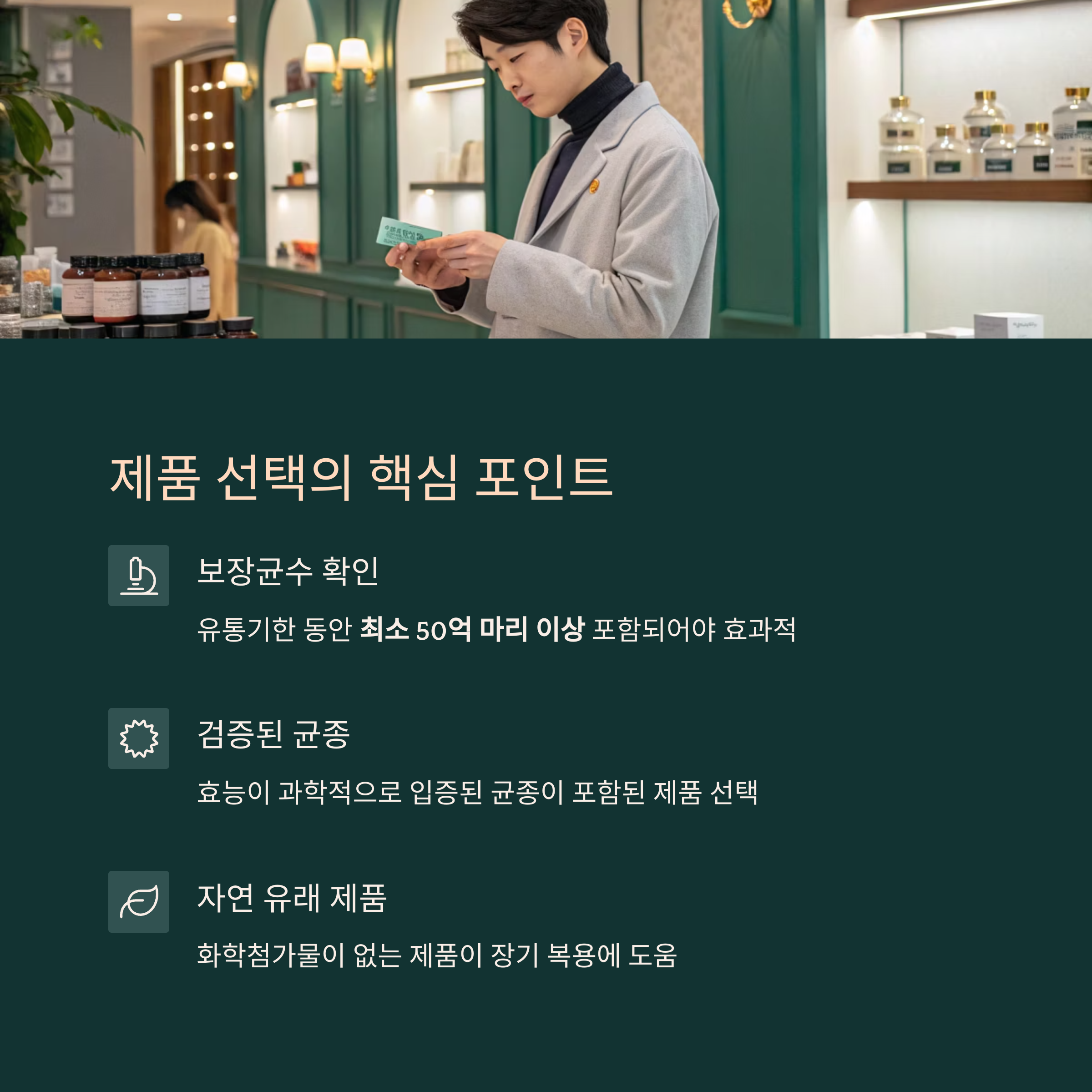 정확한 정보에 기반한 제품 선택과 꾸준한 섭취가 중요하며, 특히 균종, 보장균수, 첨가물 유무를 반드시 확인해야 합니다.