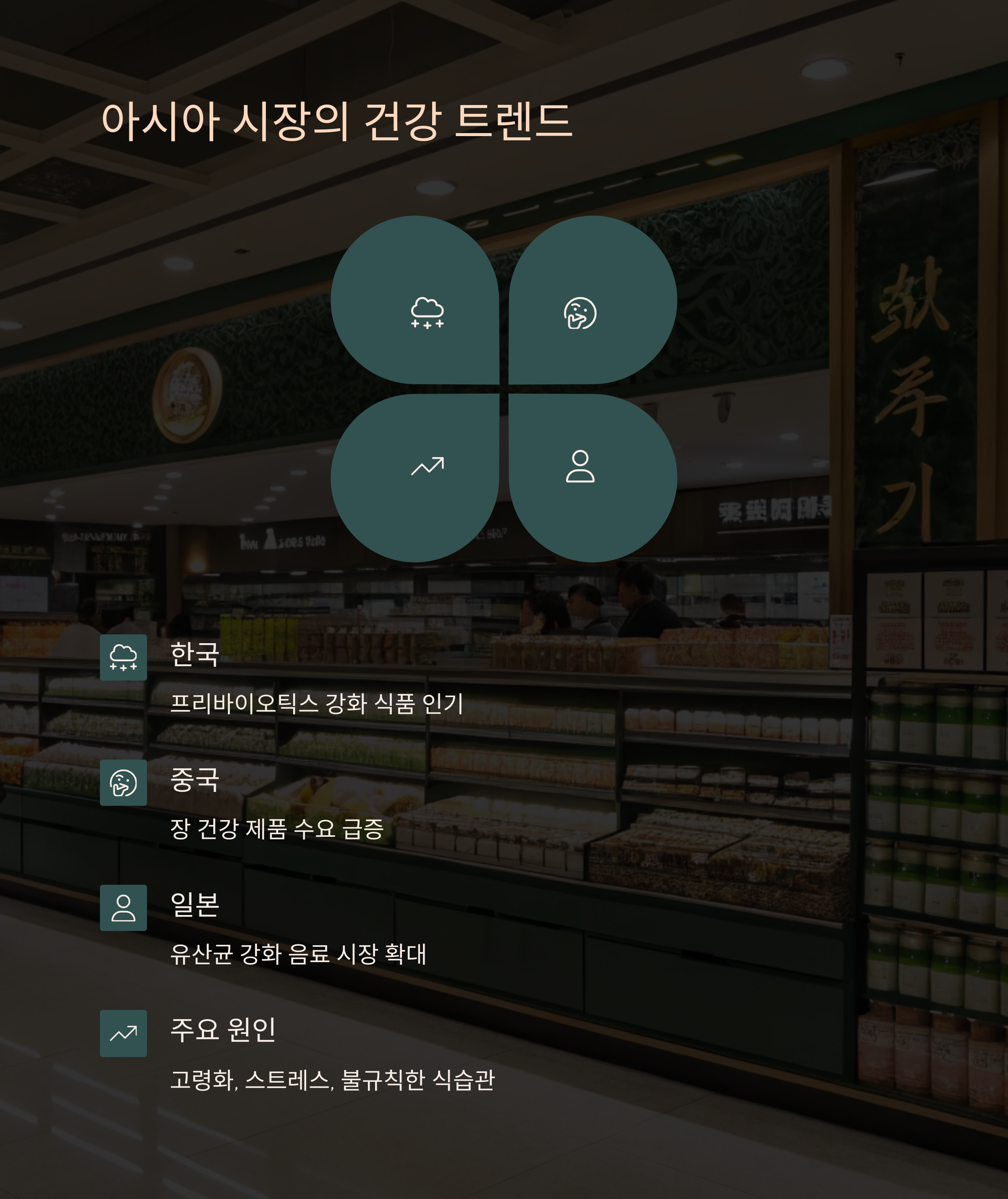 아시아 시장에서는 장 건강 및 면역력 강화에 대한 관심이 높아지며 관련 제품 수요도 빠르게 증가 중입니다.