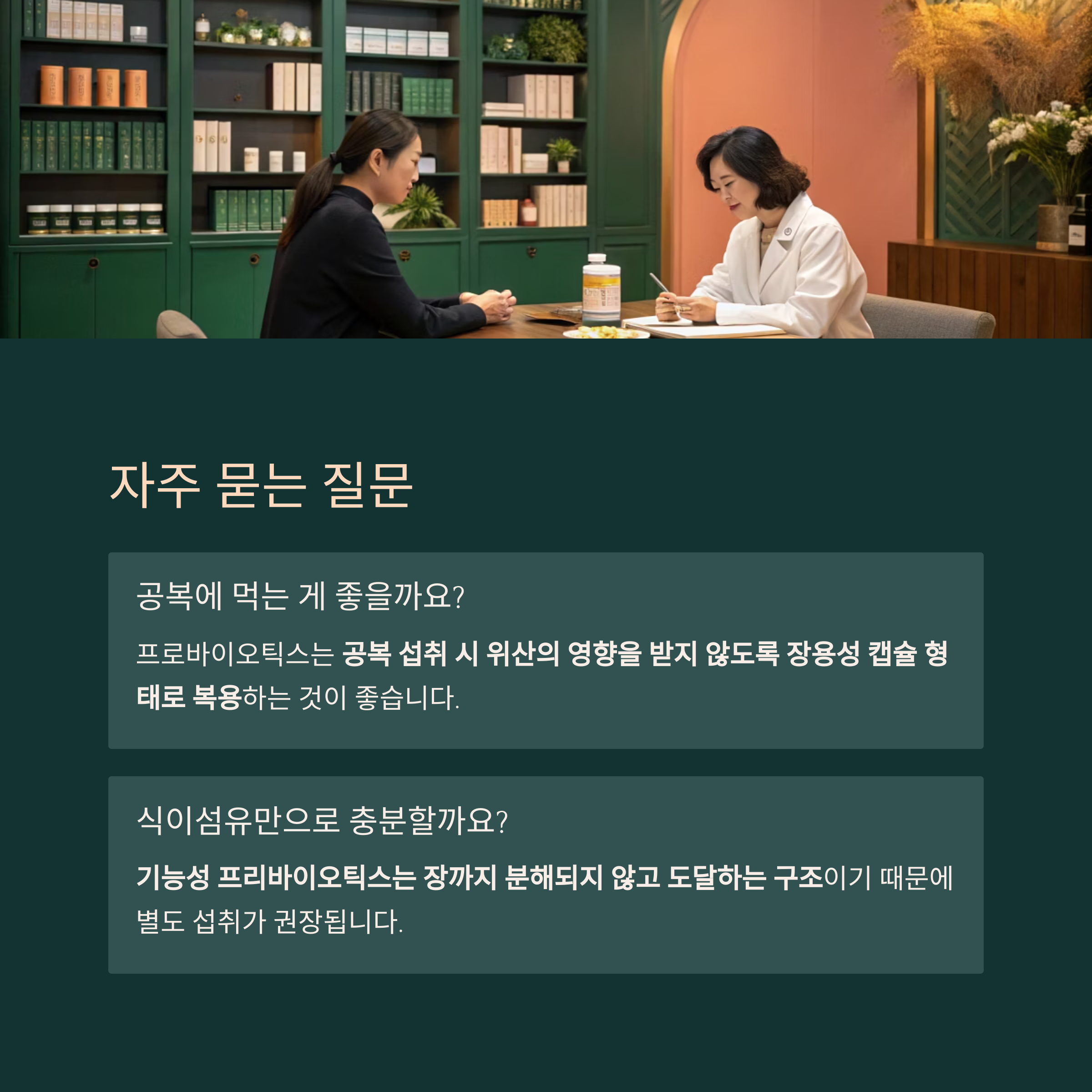 → 프로바이오틱스는 공복 섭취 시 위산의 영향을 받지 않도록 장용성 캡슐 형태로 복용하는 것이 좋습니다.