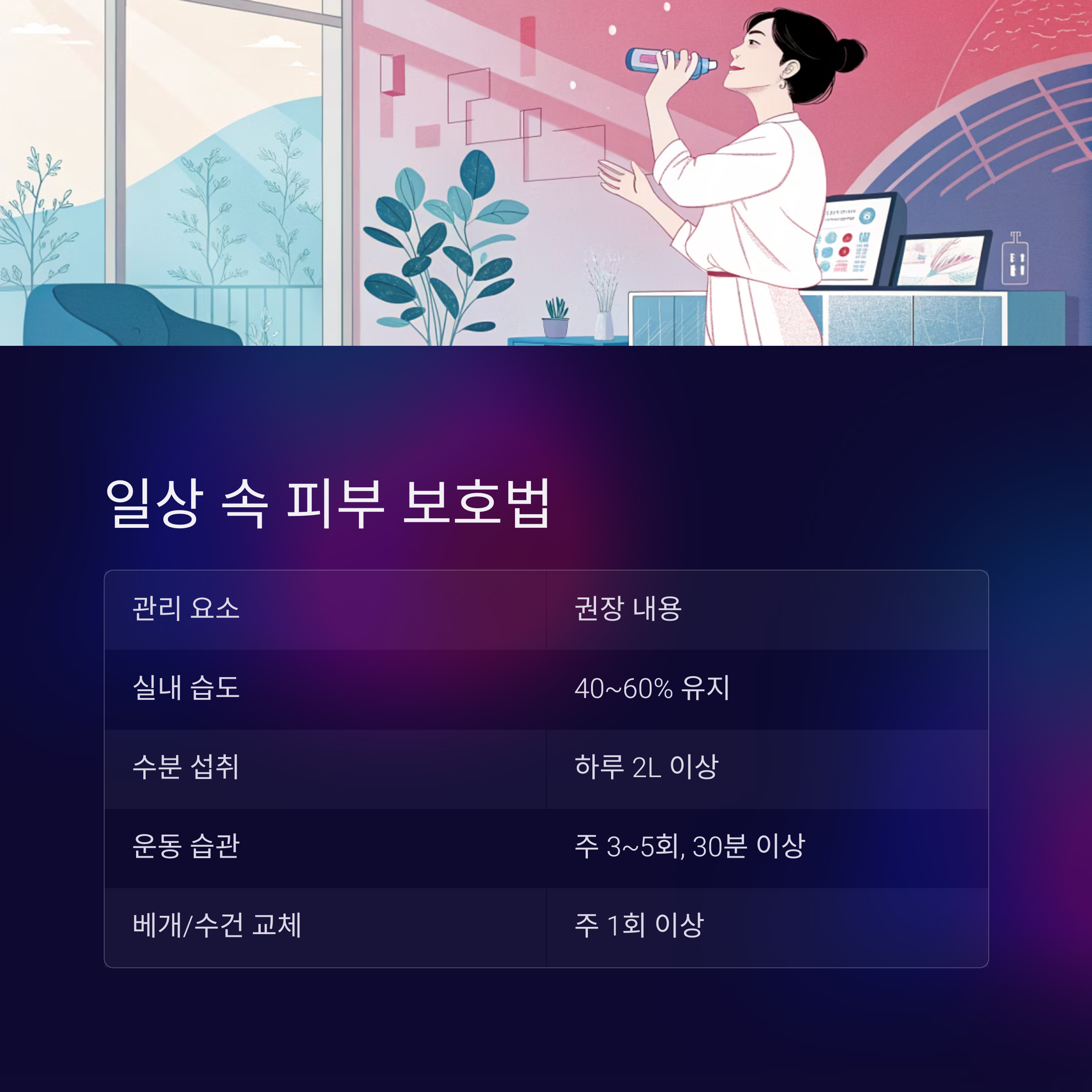 세안 후 즉시 보습제를 바르고, 수분 섭취는 하루 2L 이상 권장됩니다
