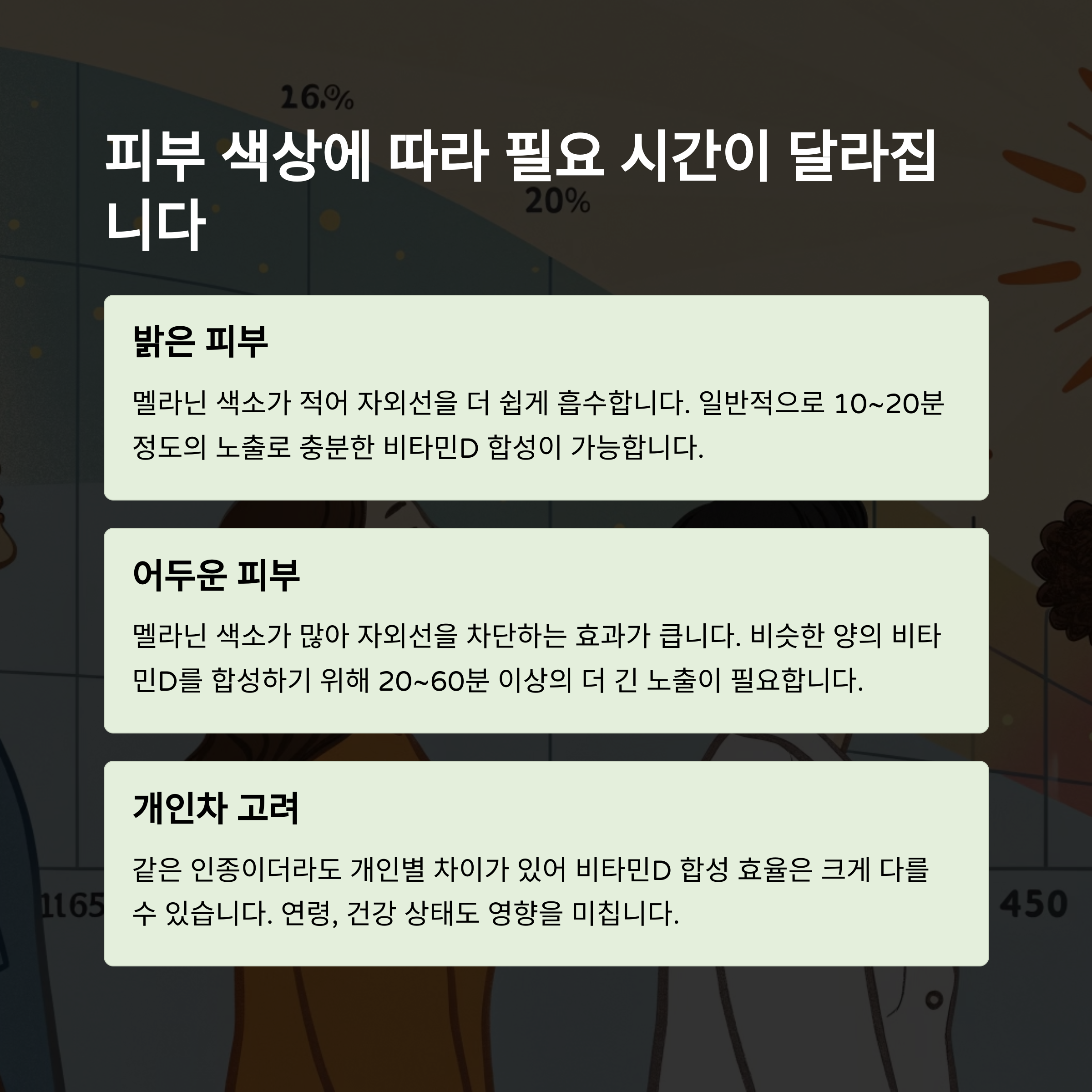 비타민D 합성을 위한 최적의 햇빛 노출 시간은 개인마다 다릅니다. 다양한 요인을 고려해 자신에게 맞는 방법을 찾는 것이 중요합니다.