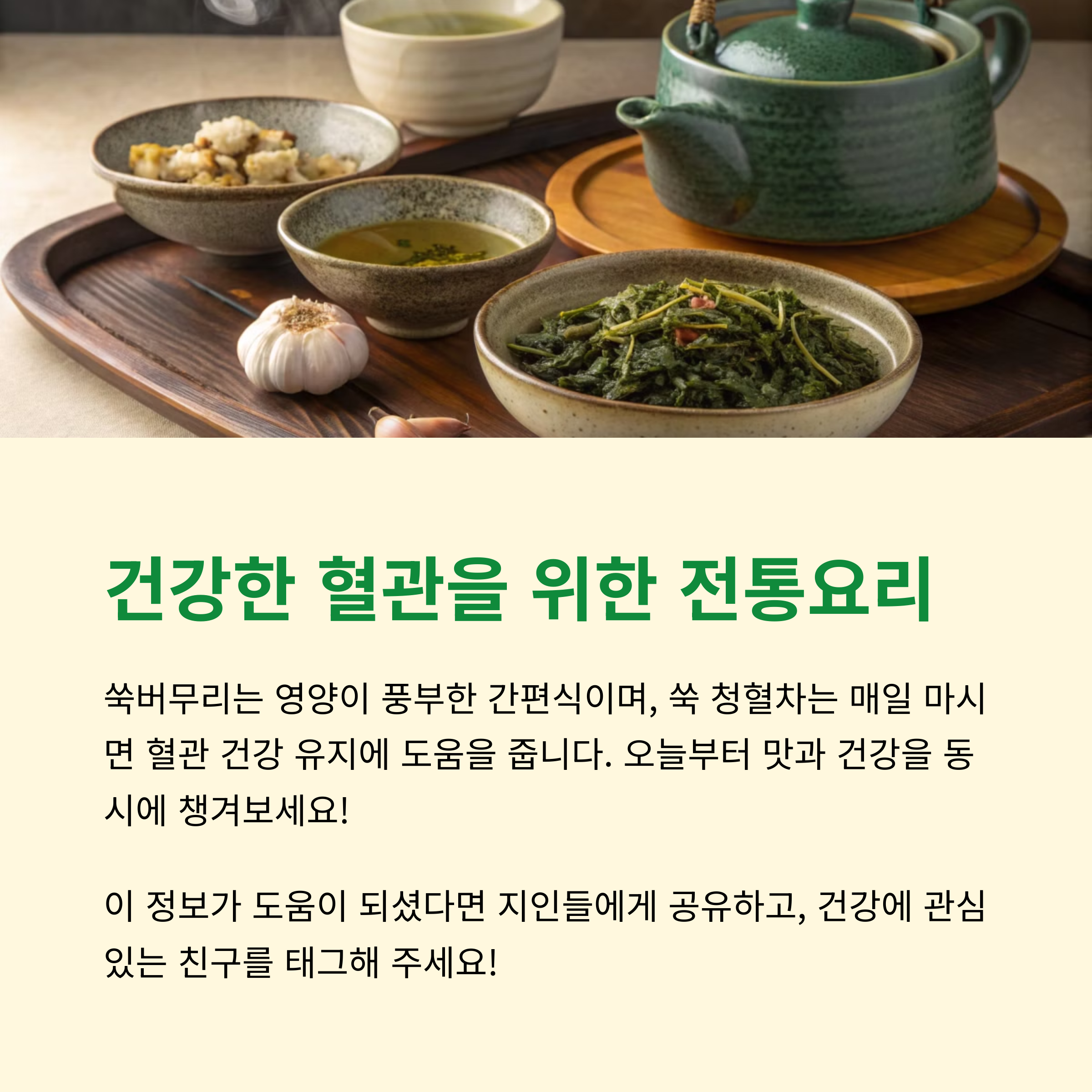혈관 건강을 위해 무언가를 새롭게 시작하고자 한다면, 복잡한 보조제보다 우리의 전통 식재료인 쑥과 마늘을 활용한 식단을 추천드립니다. 자연에서 온 식품은 몸에 순하게 작용하면서도 효과는 탁월하며, 꾸준히 섭취하면 심혈관 건강뿐 아니라 전반적인 면역력 향상에도 큰 도움을 줍니다. 오늘 소개한 쑥버무리, 쑥 청혈차 등은 손쉽게 만들 수 있는 건강 요리로, 일상에서 바로 실천할 수 있는 습관이 될 것입니다. 우리의 음식, 우리의 건강을 위한 지혜로운 선택, 지금 시작해보세요.