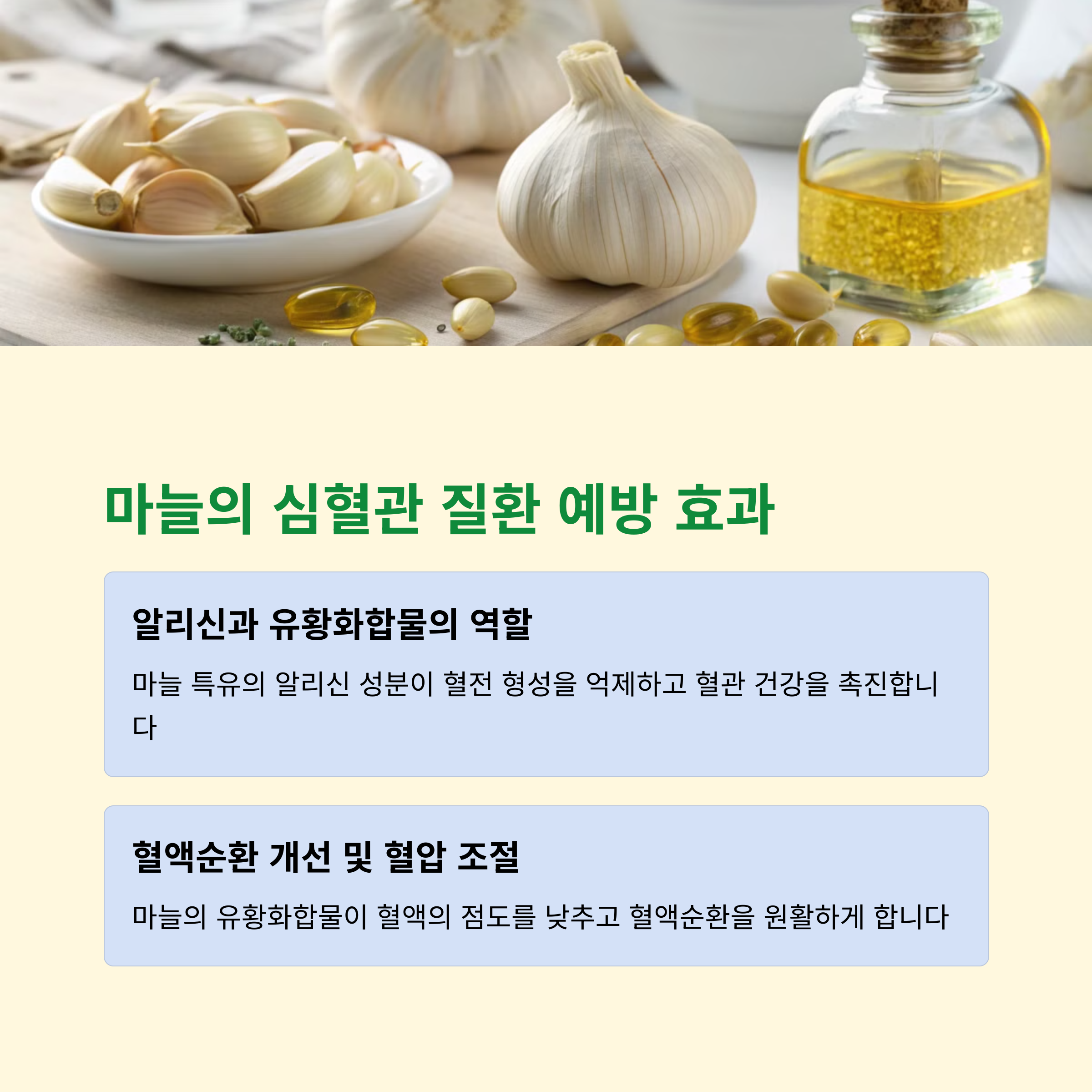 | 마늘의 역할 | 심혈관 질환 예방과 면역력 강화에 효과적입니다. |