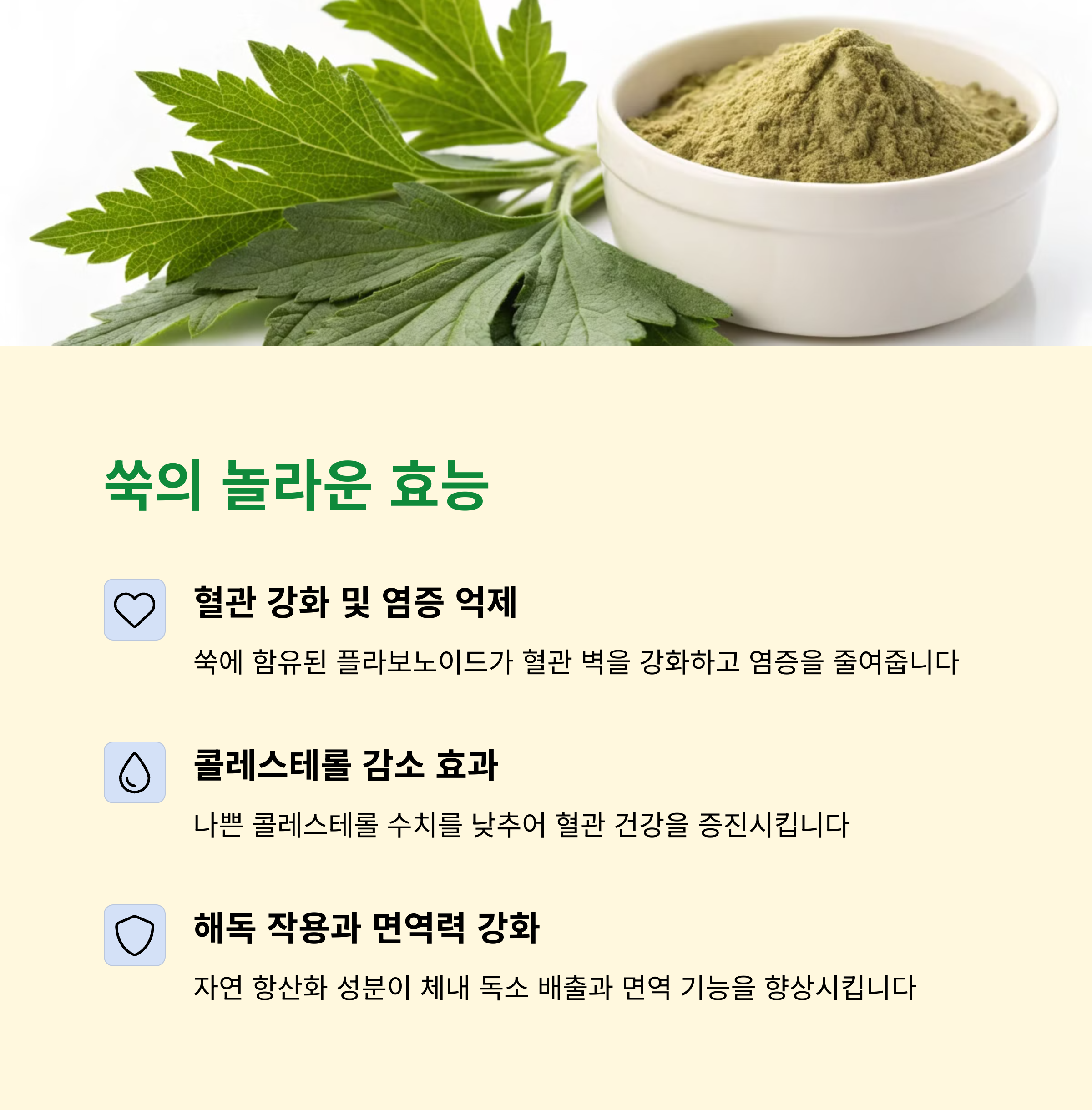 | 쑥의 효능 | 염증 억제 및 혈관 강화에 도움을 줍니다. |