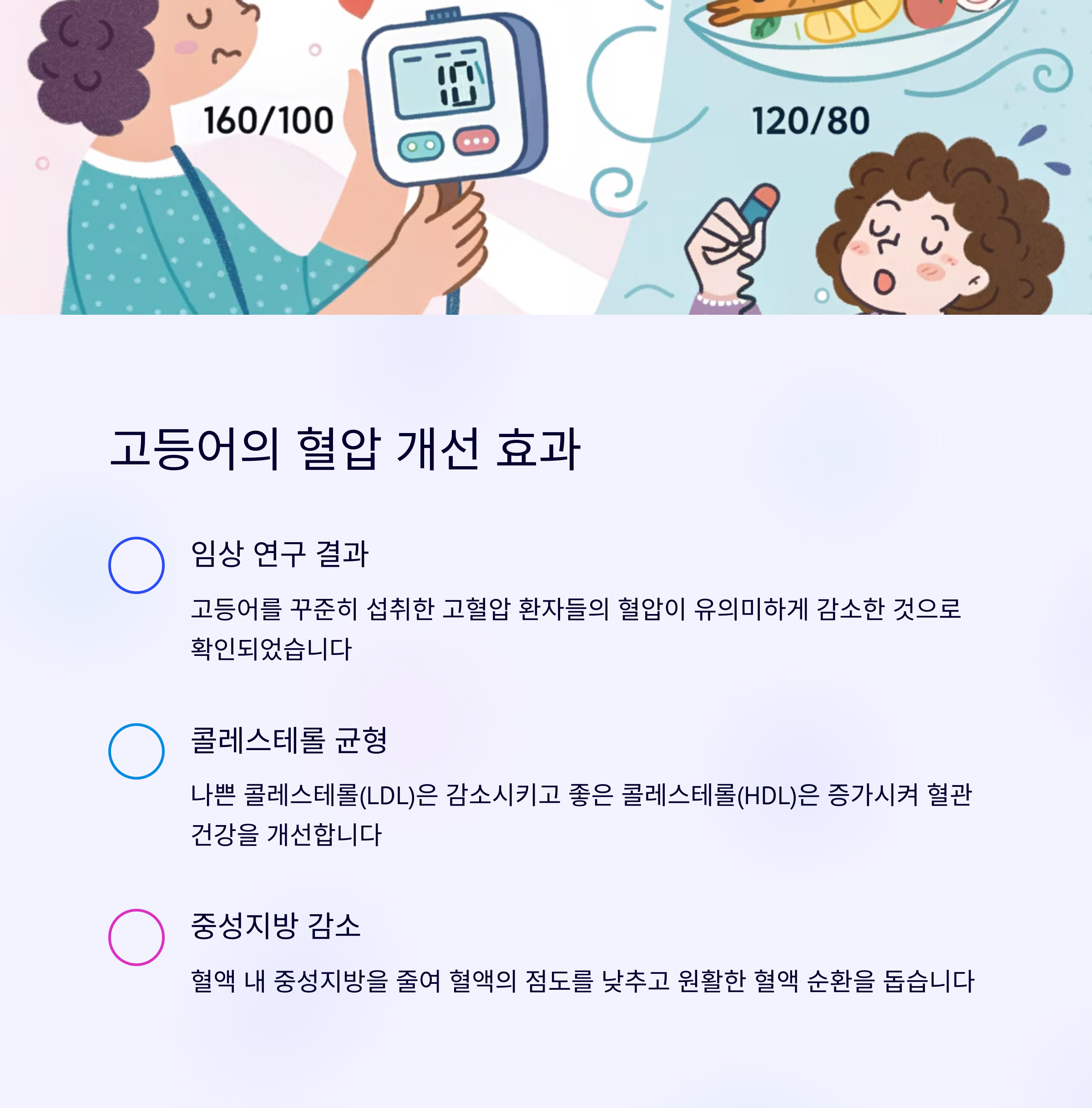또한, 주 3회 고등어 필레를 8개월간 섭취한 실험에서도 혈압 안정 효과가 확인되었습니다.