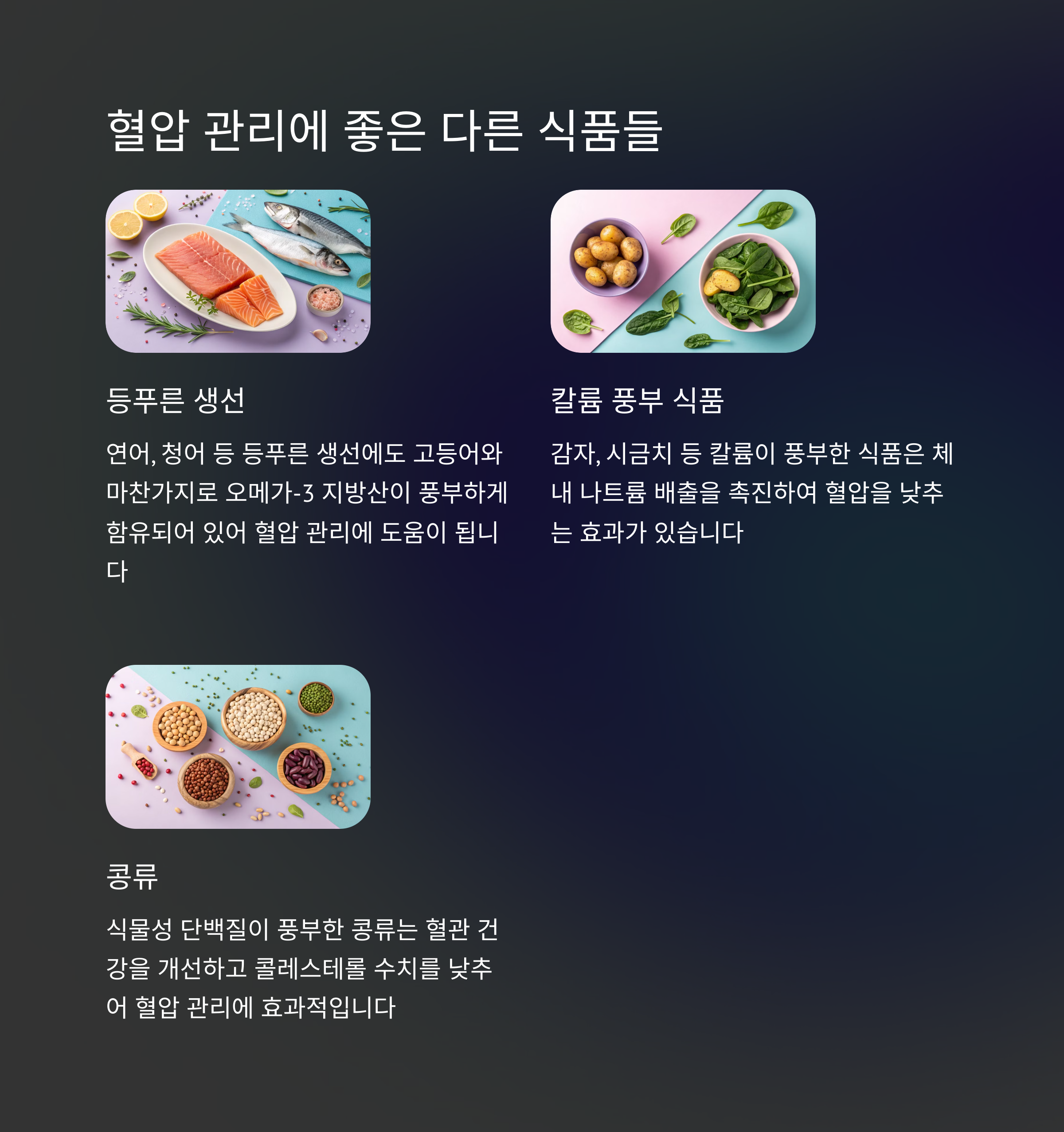 | 콩류 | 식물성 단백질로 혈압 안정 | - |
