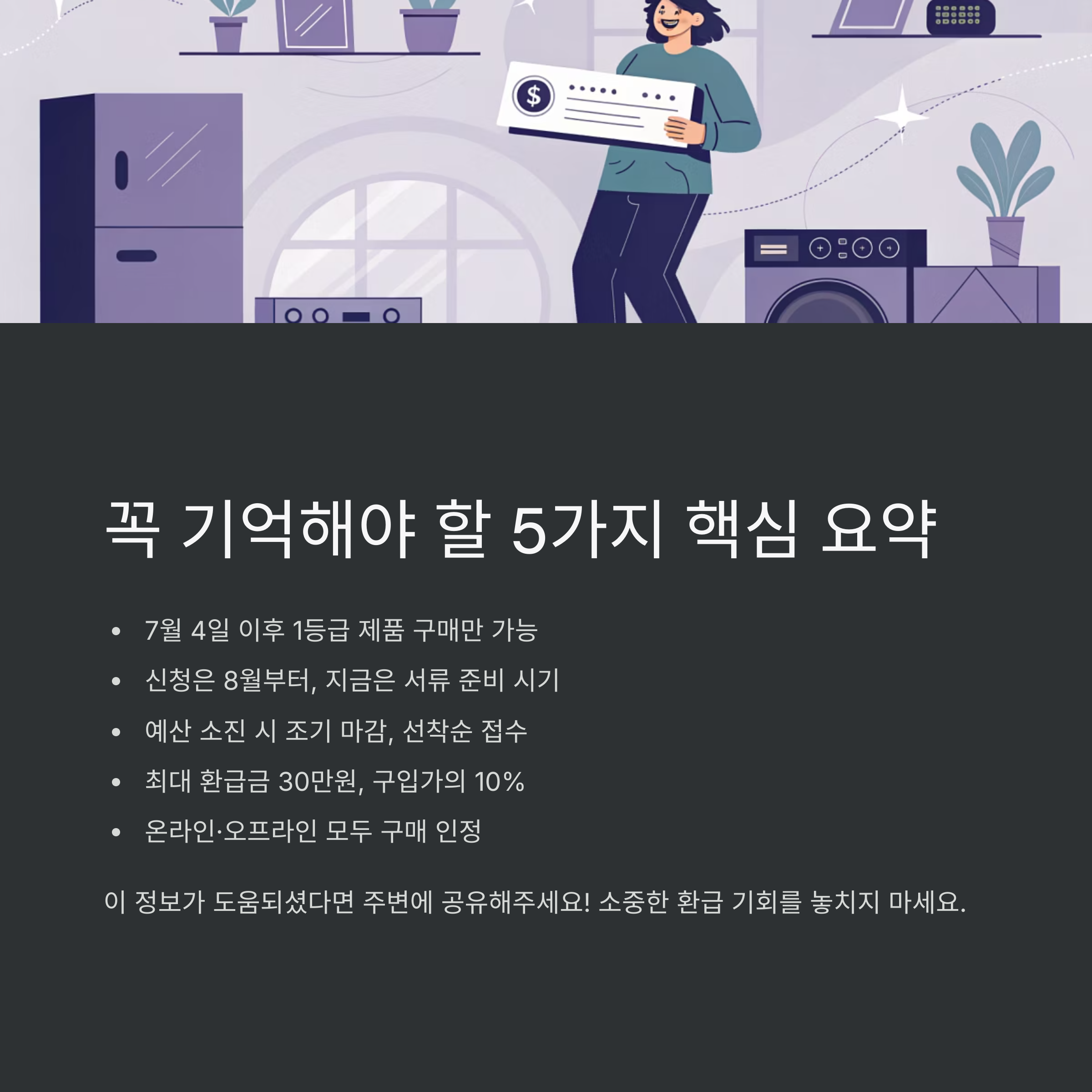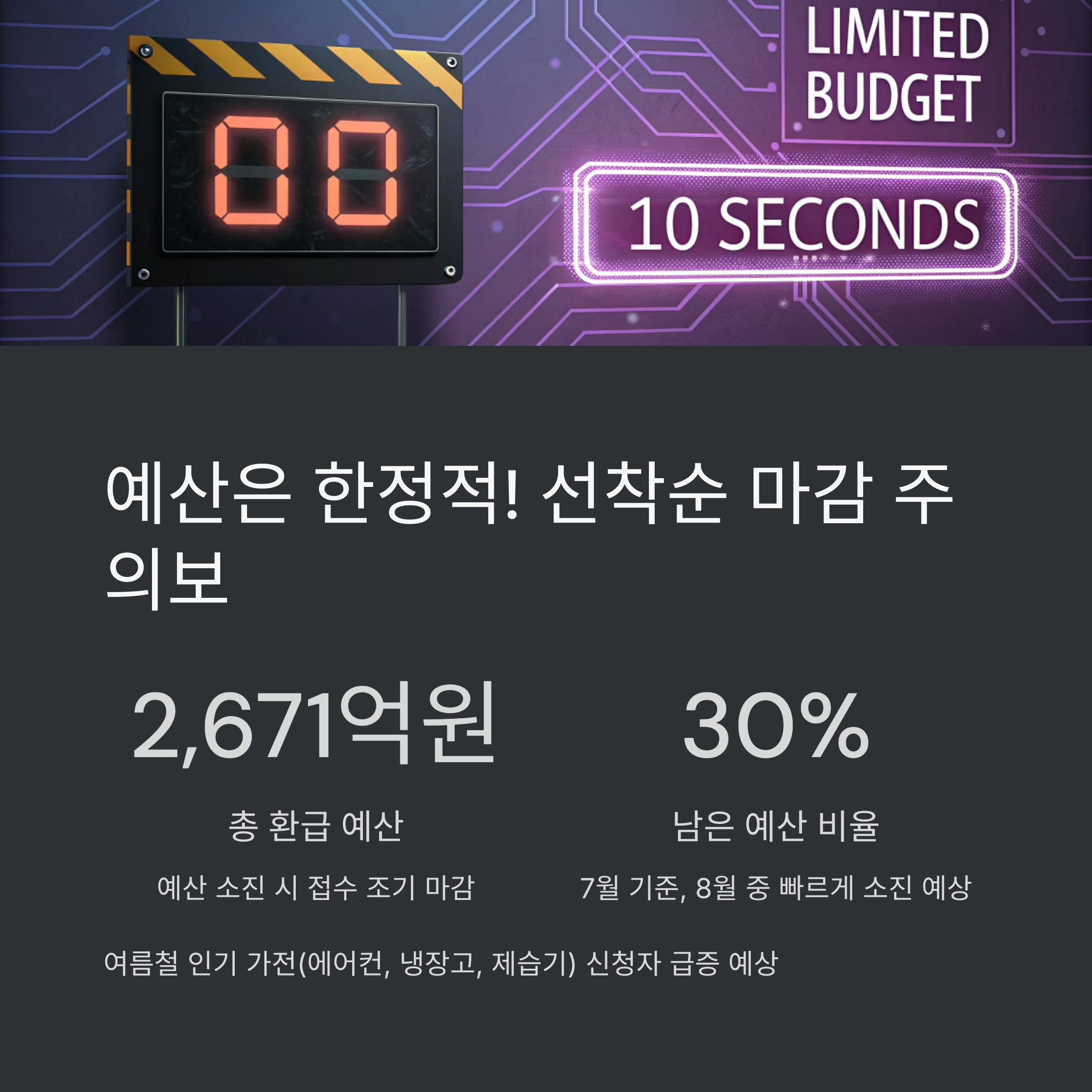 특히 에어컨, 냉장고, 제습기 등 계절 품목은 신청자가 급증할 수 있으니 가능한 빠른 접수가 중요합니다.