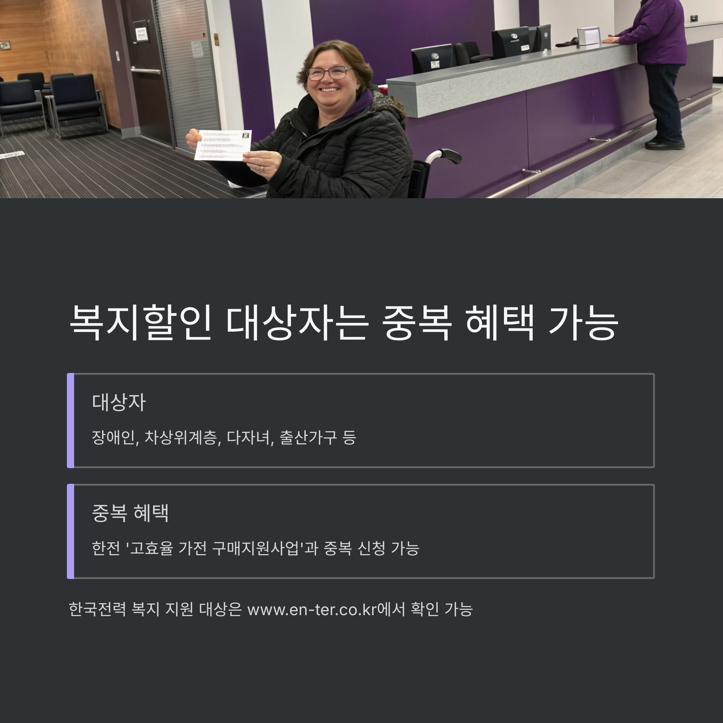 장애인, 차상위계층, 다자녀, 출산가구 등 복지할인 대상은 한국전력에서 시행 중인 '고효율 가전 구매지원사업'과 중복 신청이 가능합니다.