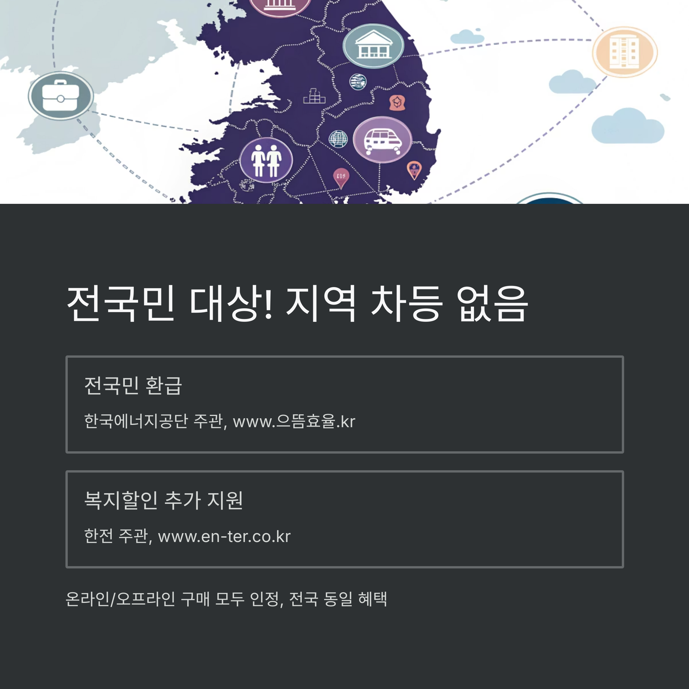 단일 신청 시스템을 통해 전국 어디서든 동일한 혜택을 받을 수 있으며, 온라인 쇼핑몰 또는 전국 4만여 오프라인 매장 구매 모두 인정됩니다.