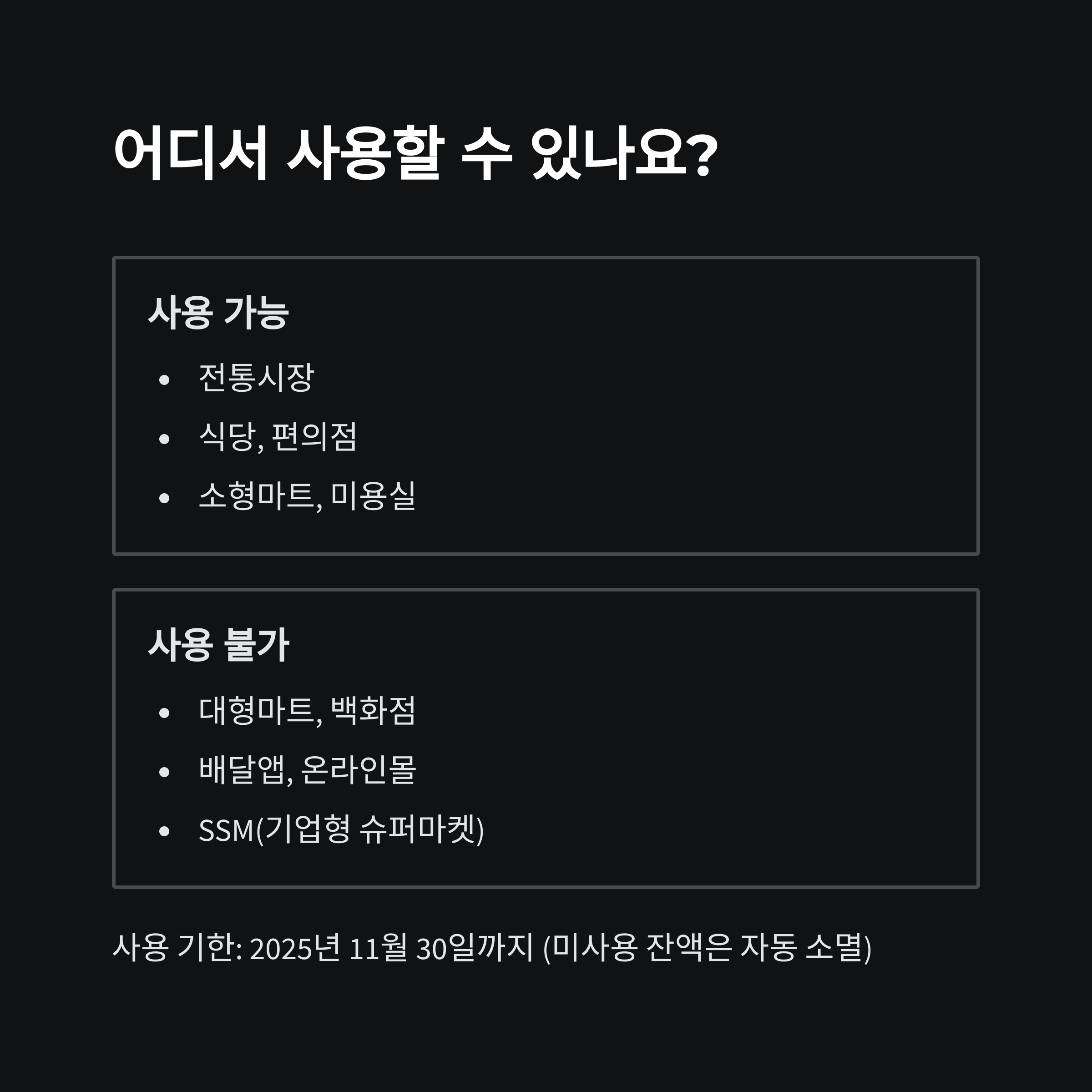 | 전통시장, 식당, 편의점 | 대형마트, 백화점, 배달앱 등 |