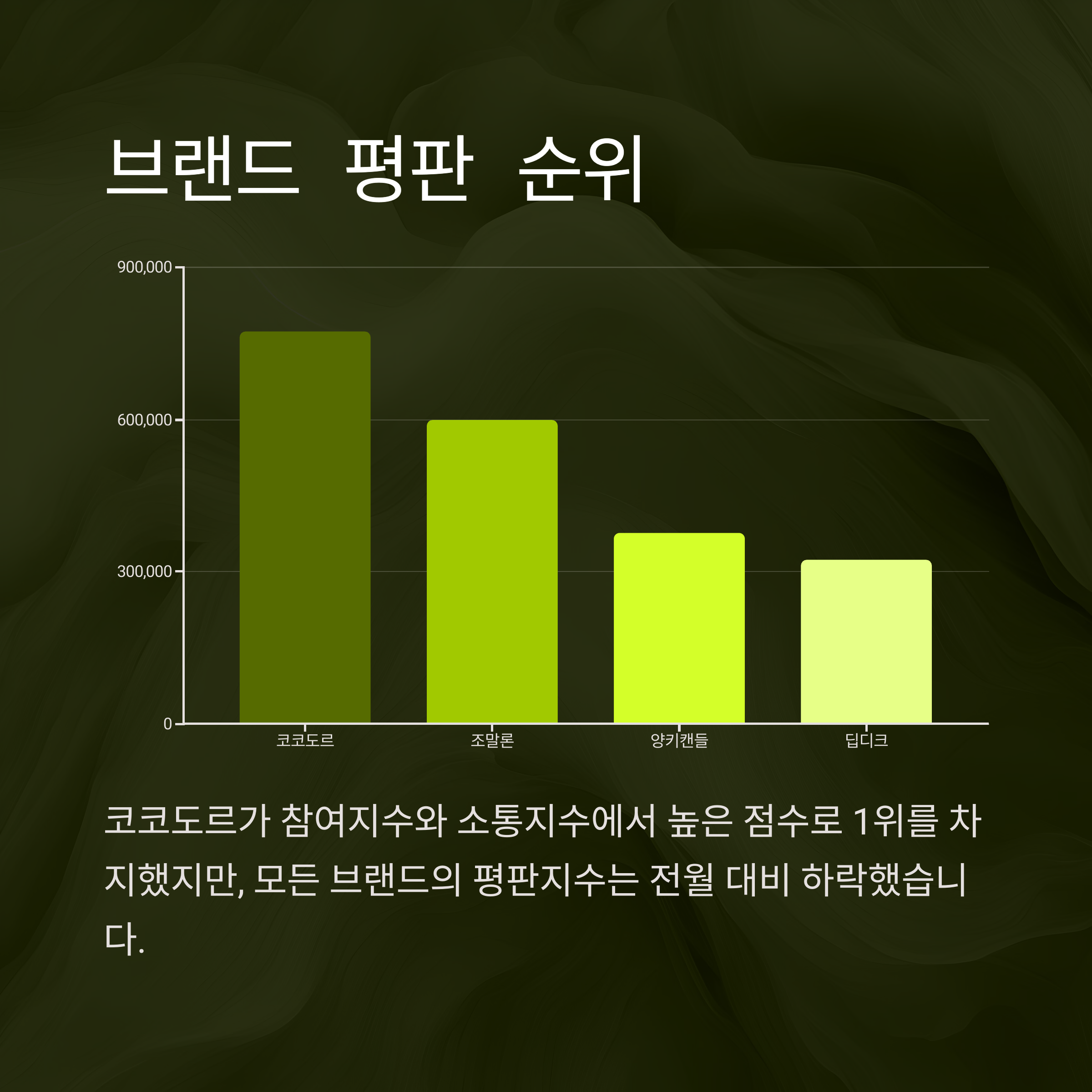 - 브랜드 평판 하락: 주요 브랜드의 평판지수가 전월 대비 모두 하락했으며, 이는 사용자 만족도 관리의 중요성을 시사합니다.