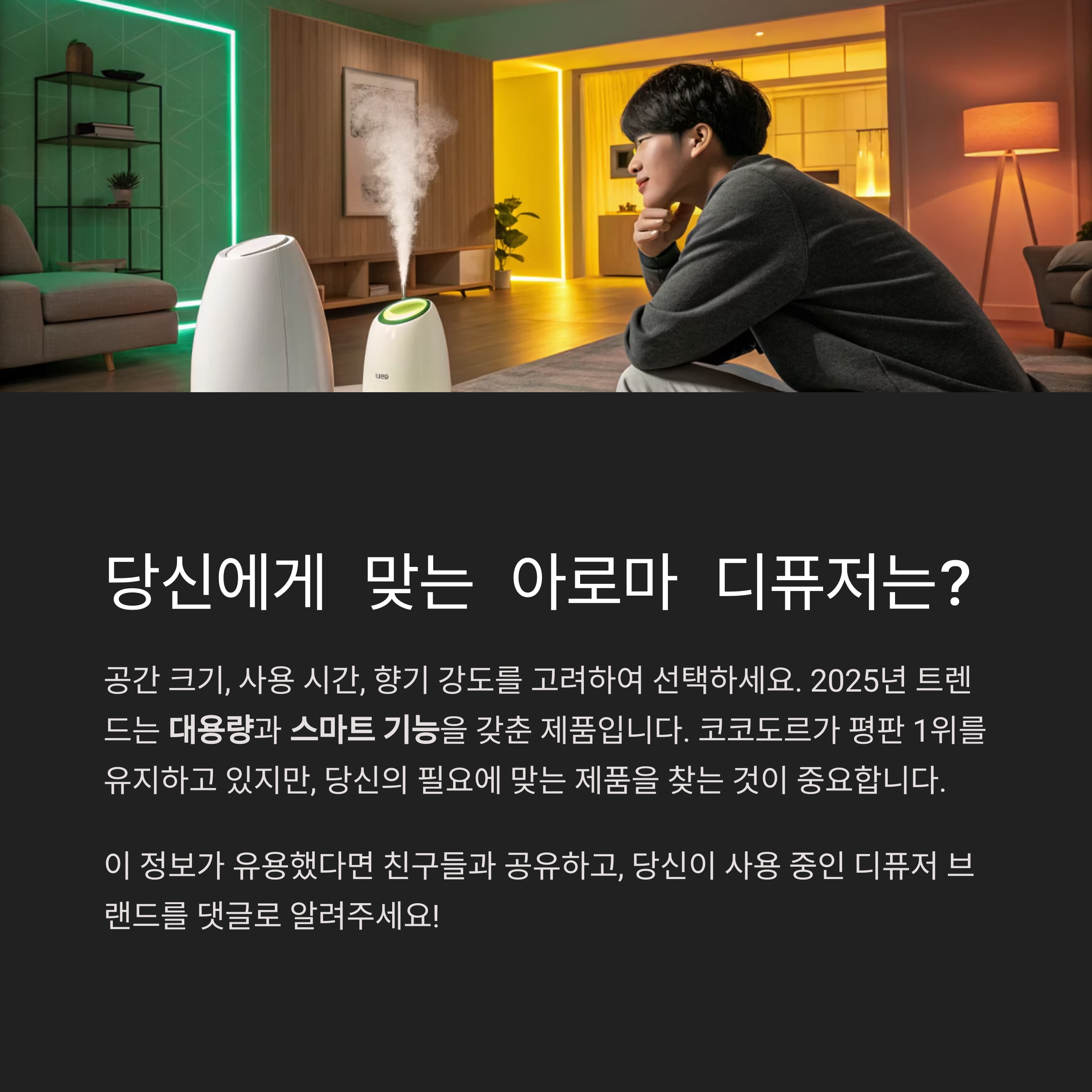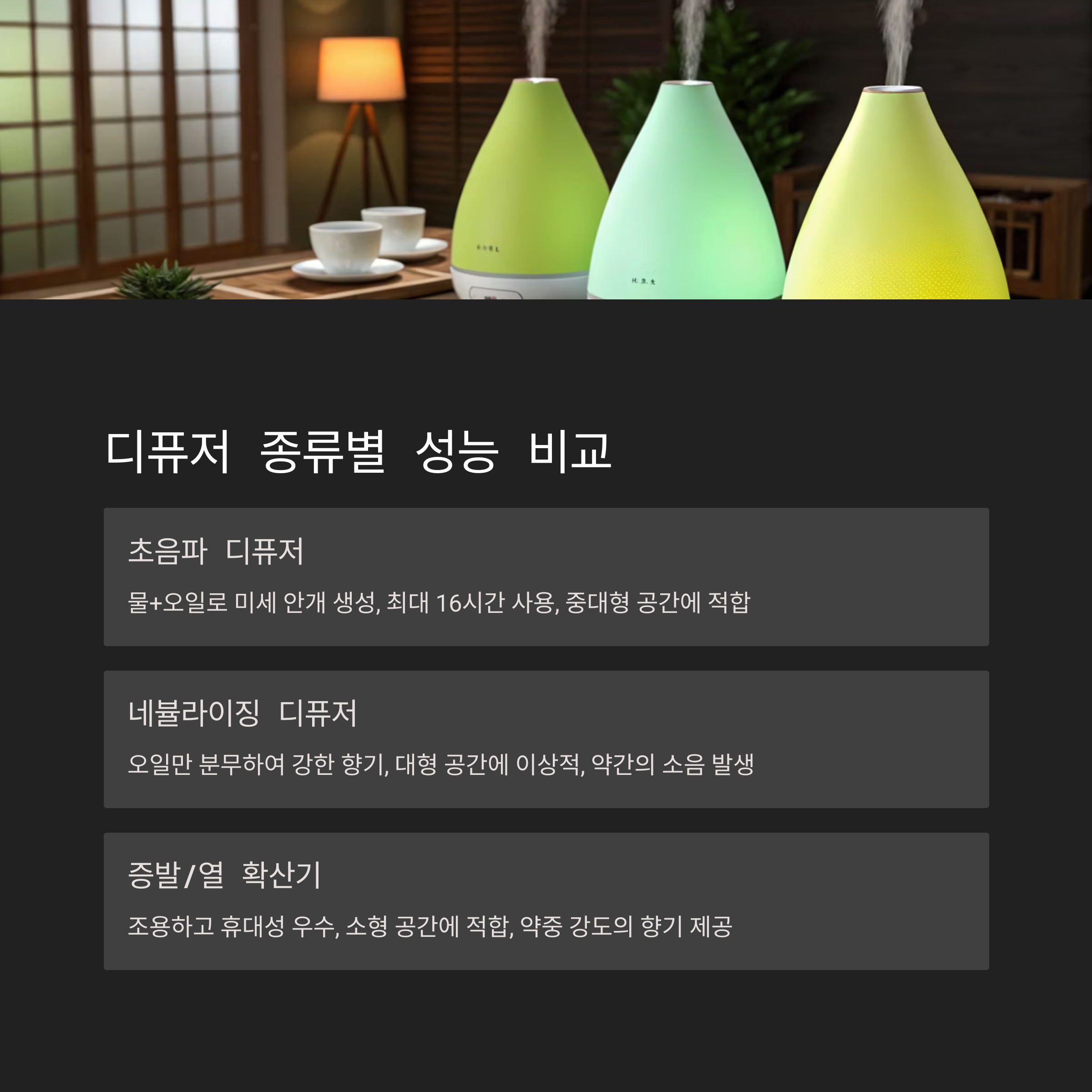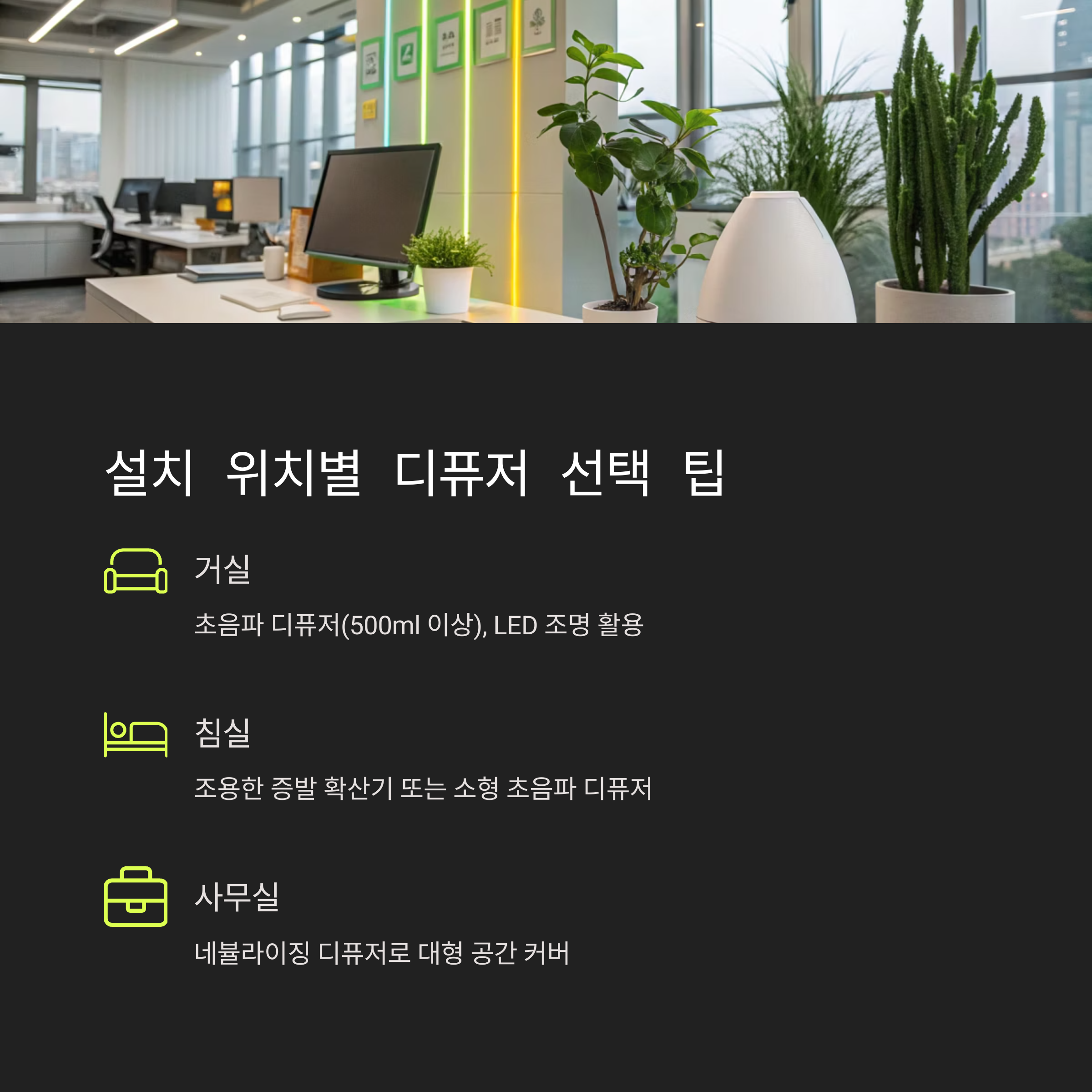 - 거실: 초음파 디퓨저(500ml 이상)로 장시간 사용, LED 조명 활용 가능.