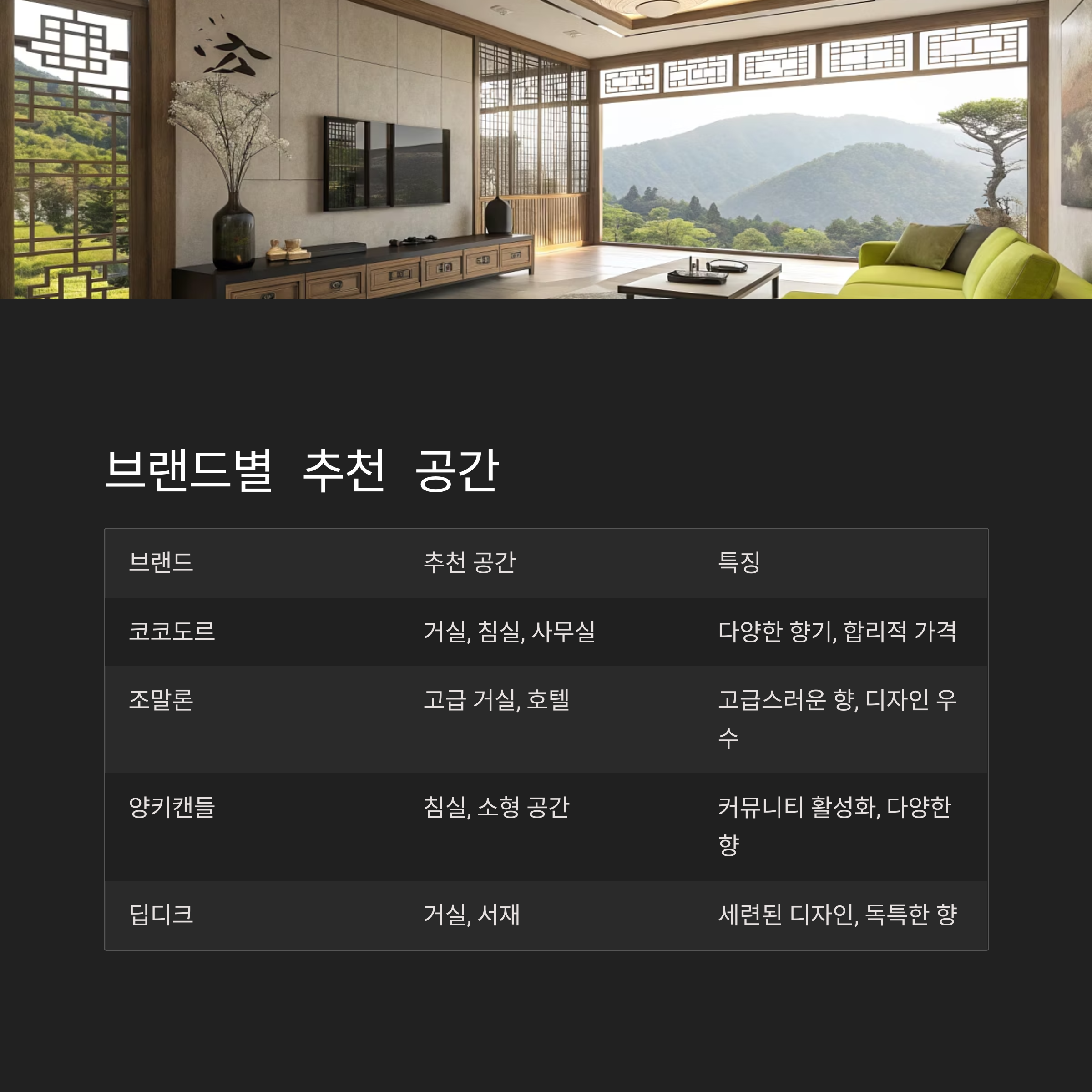 | 코코도르 | 거실, 침실, 사무실 | 다양한 향기, 합리적 가격 | 평판지수 하락 중 |